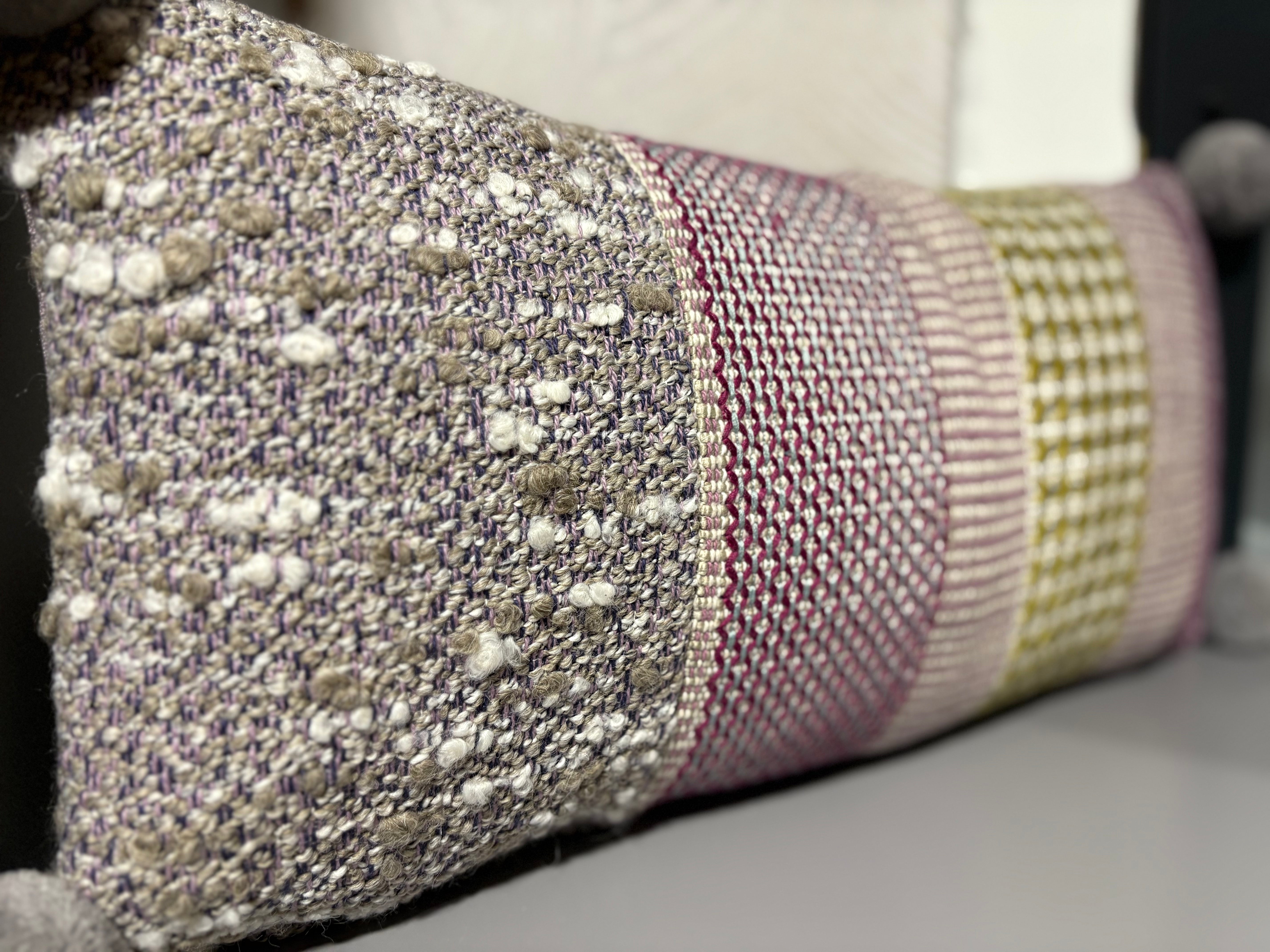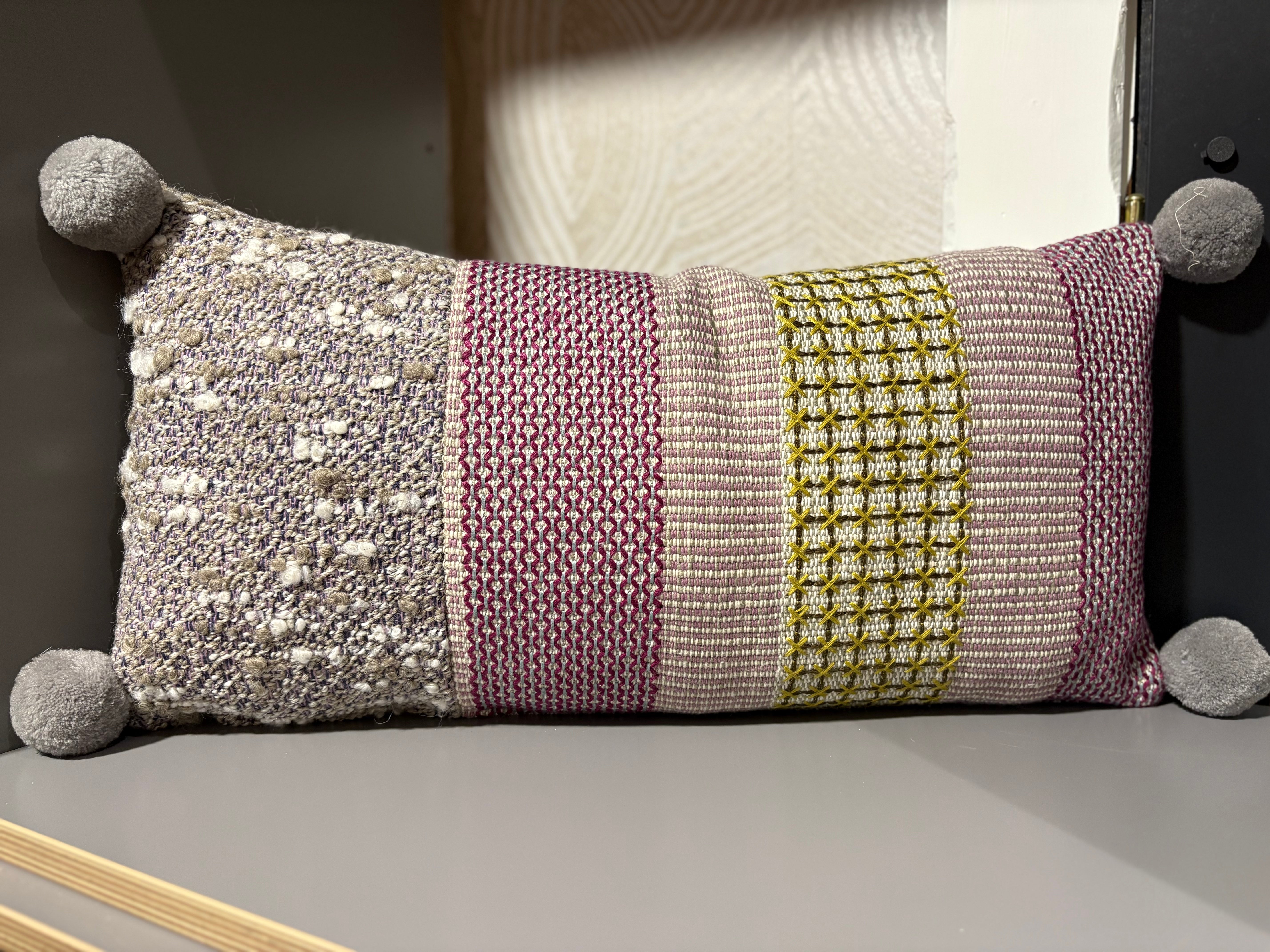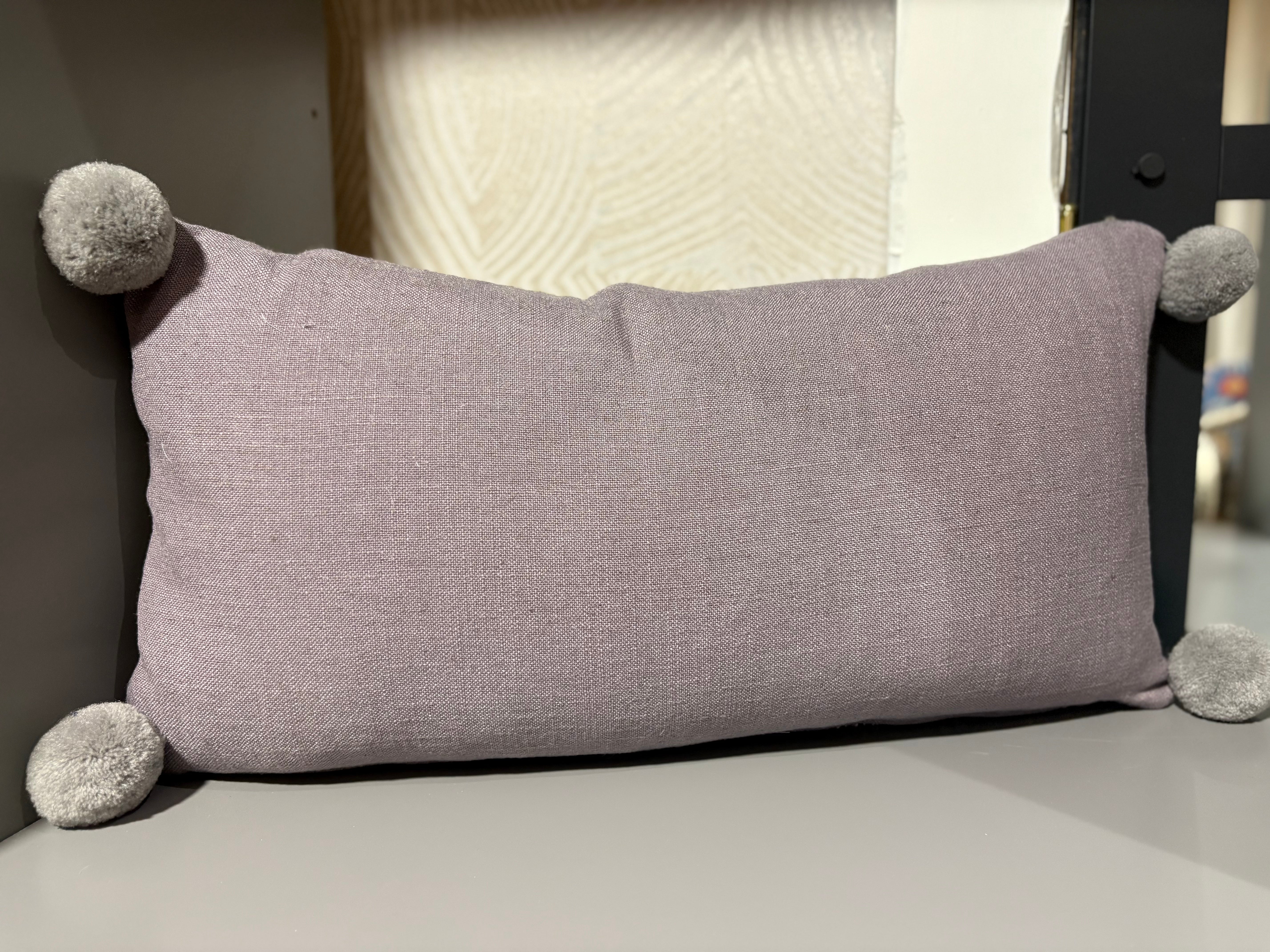 Boussac cushion featuring a woven fabric with cross stitching and other interesting techniques, backed in a soft lavender linen, and featuring a jumbo pom pom in each corner.