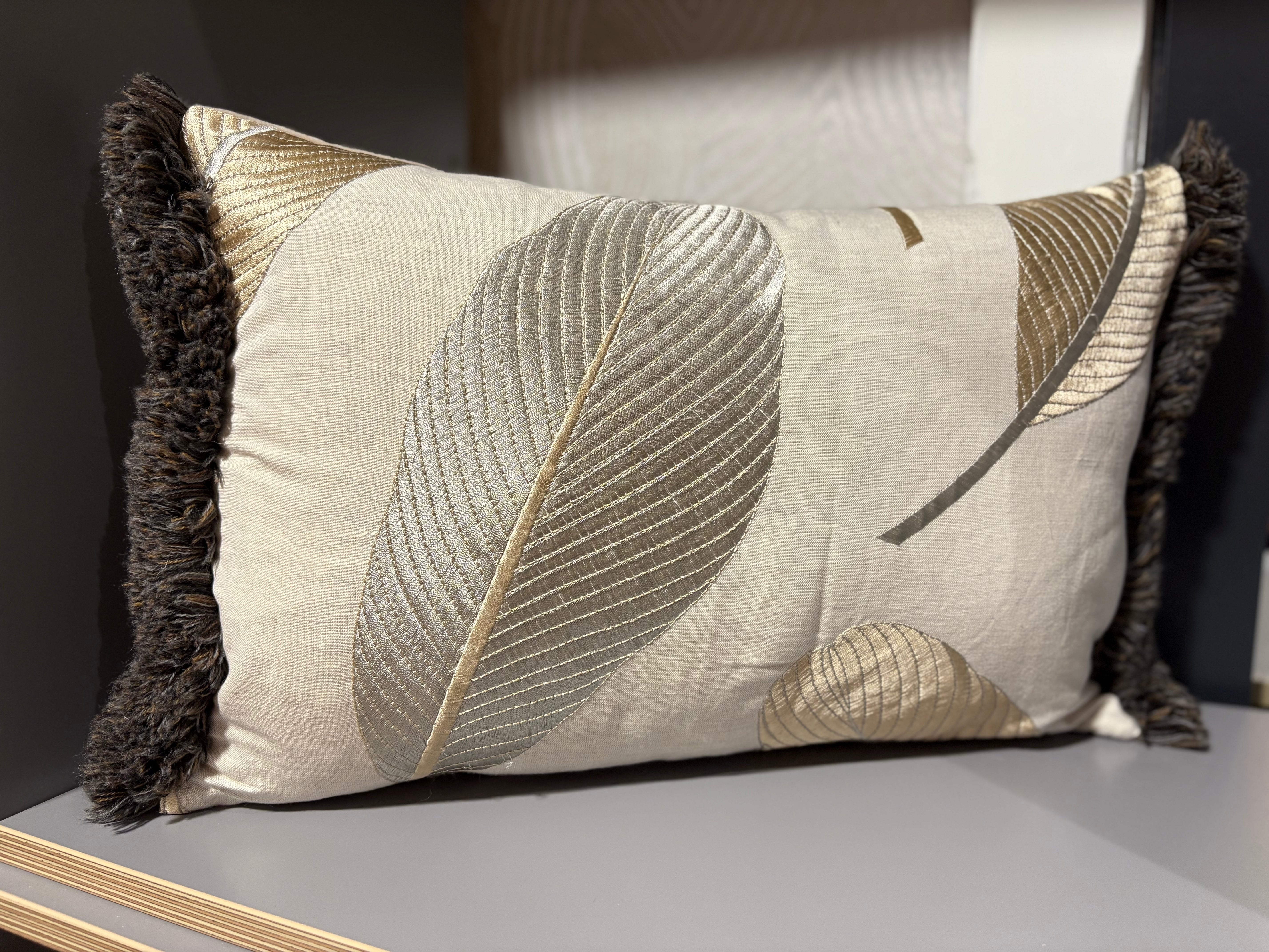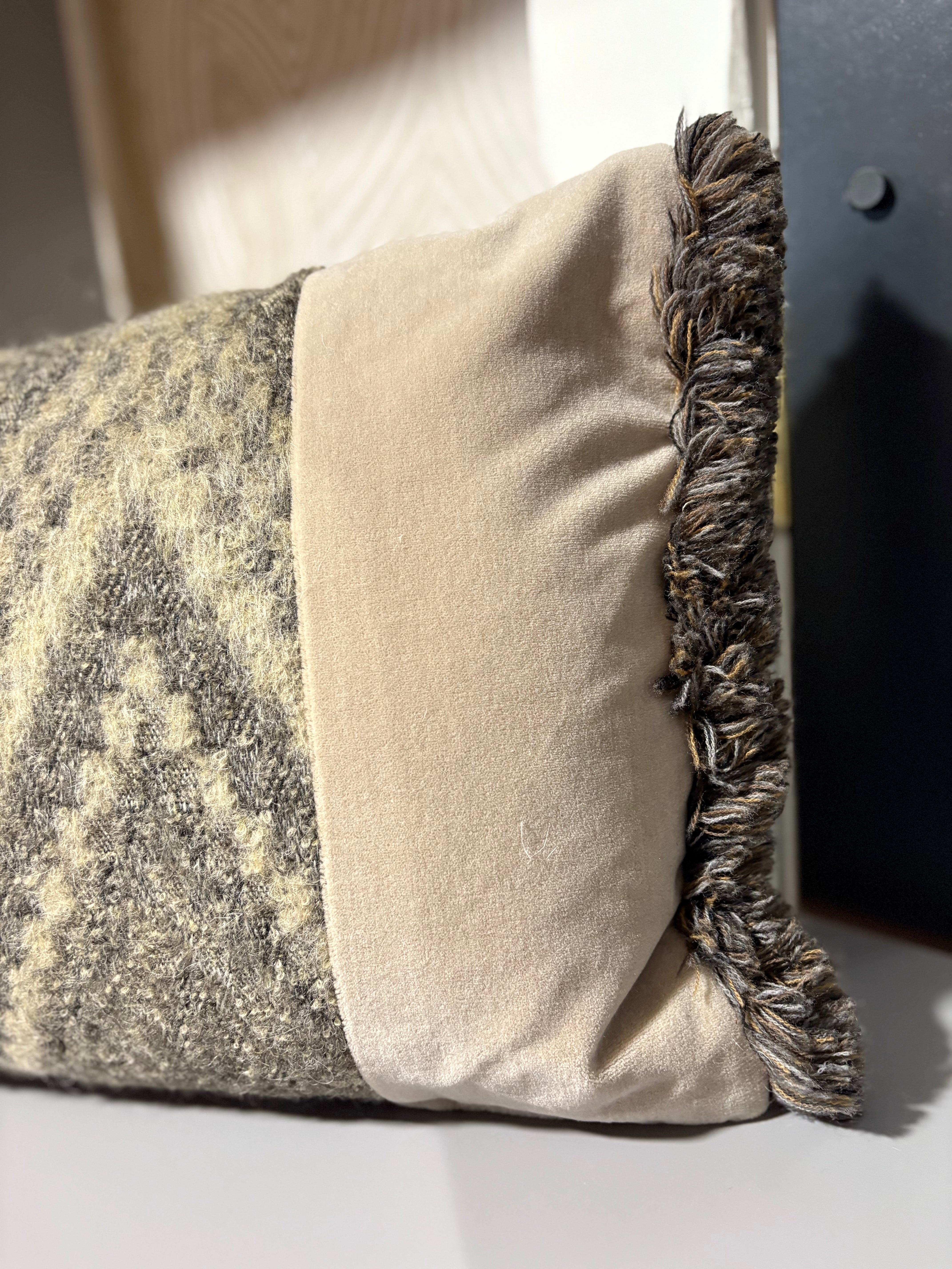 A mix of Boussac mohair chevron and Larsen embroidery fabrics in a contemporary palette of grey and neutral. A jumbo wool ruche down both sides from Samuel & Sons adds a beautiful trim to finish.