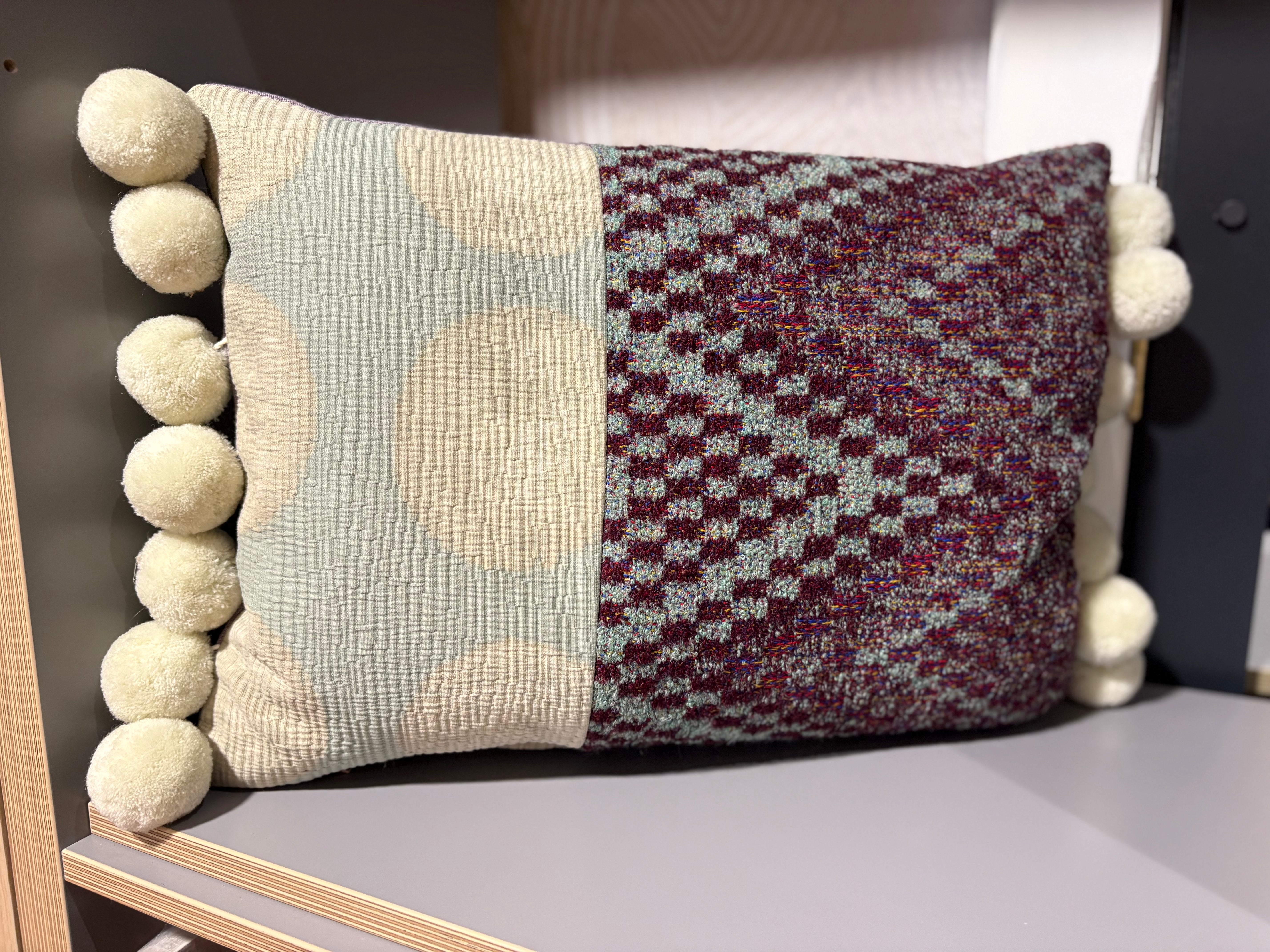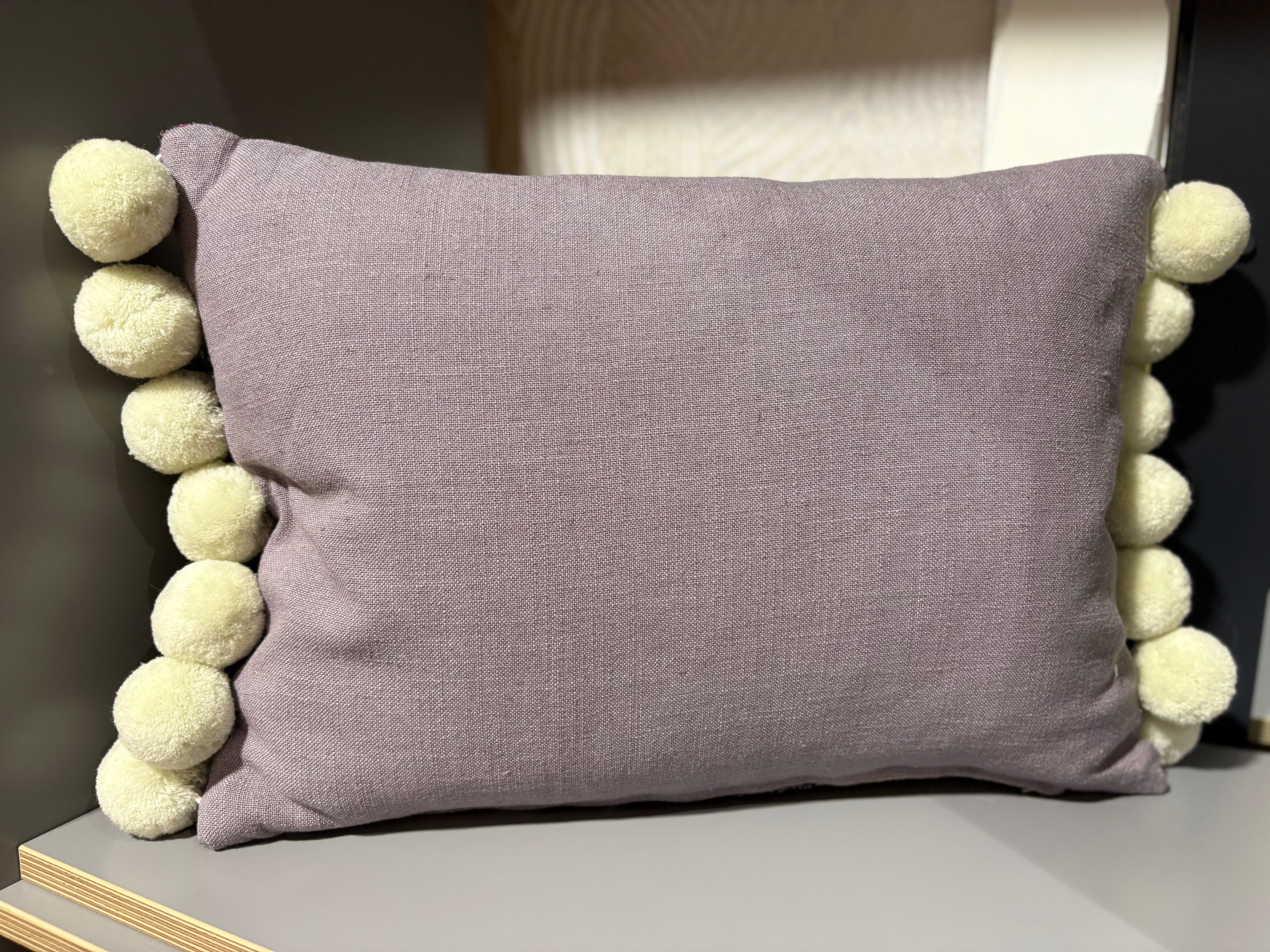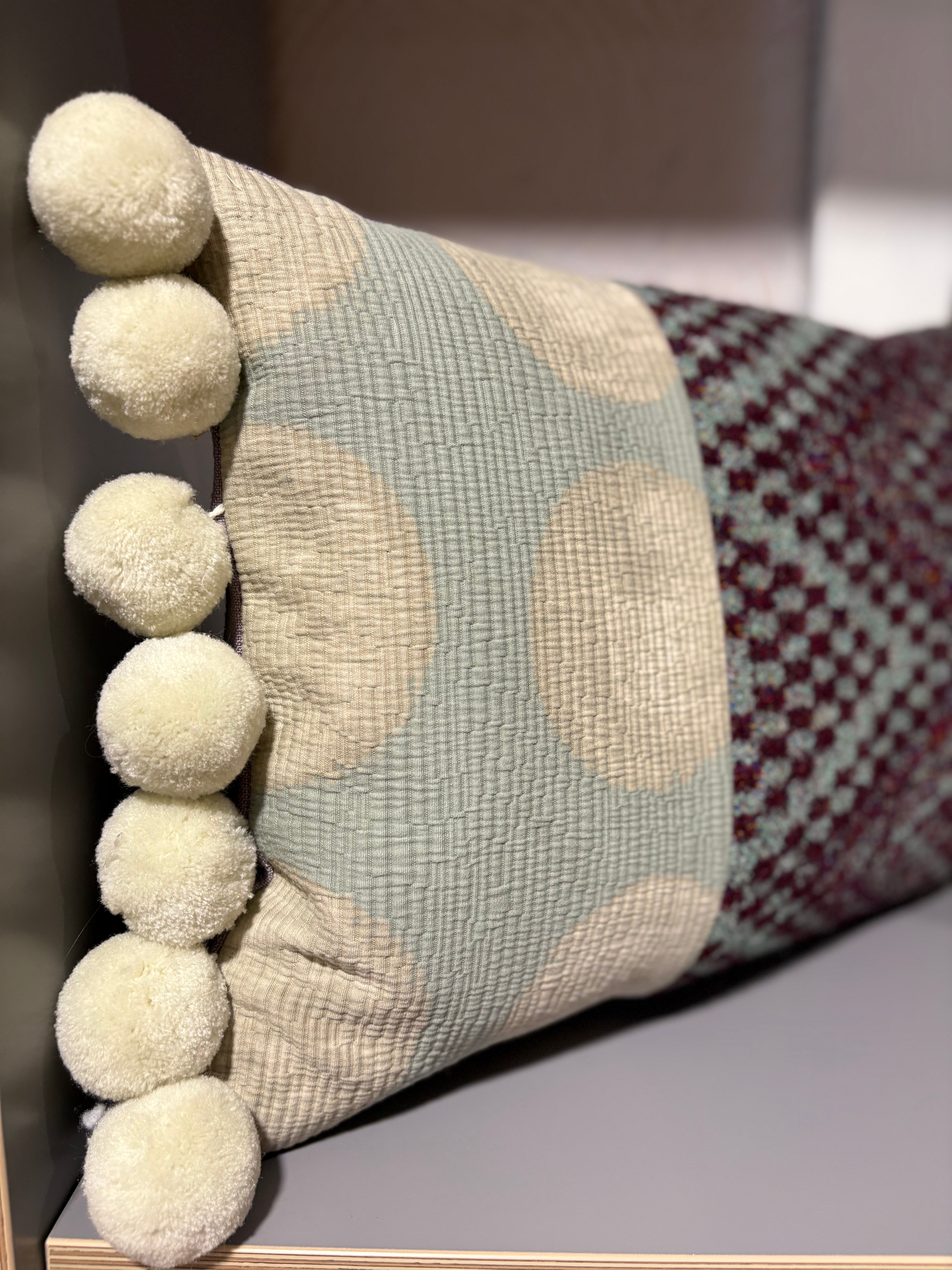 Mix of Boussac fabrics in an unusual palette of duck egg blue and mulberry with a jumbo ivory pom pom and a lavender backing.