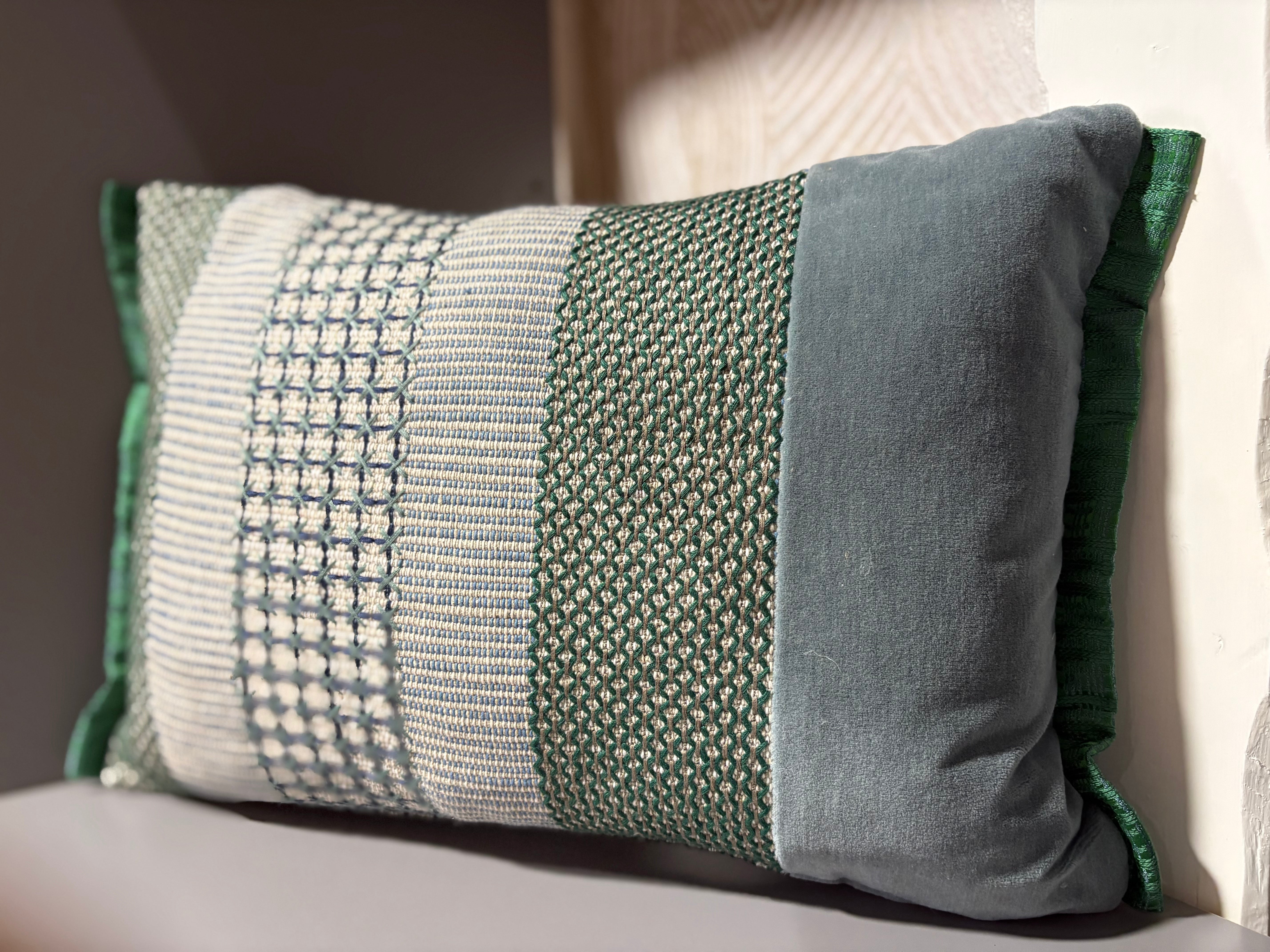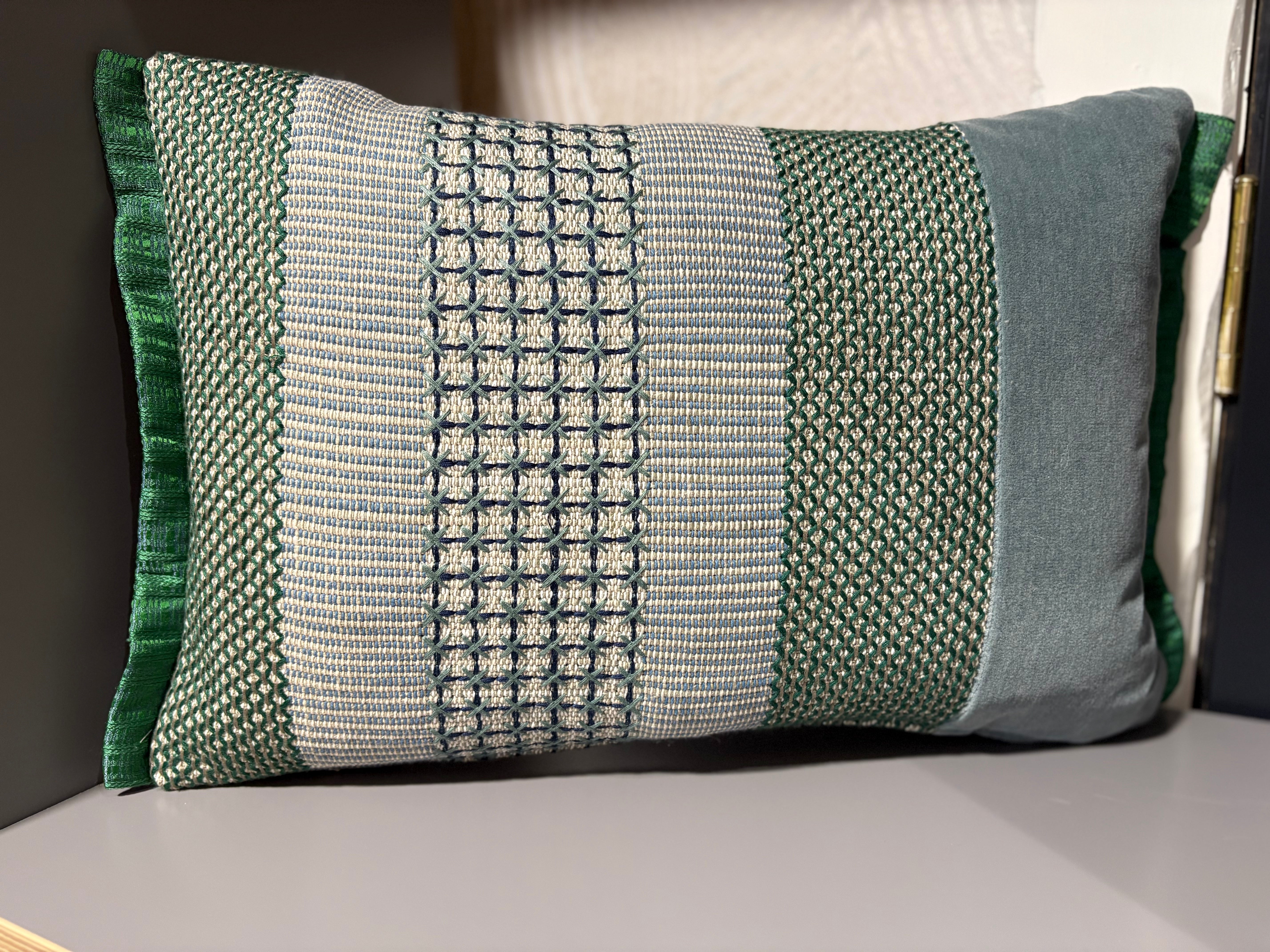 A mix of Boussac fabrics featuring beautiful woven fabrics with cross stitching and other interesting techniques. Green rubelli borders and a grey textured linen on the reverse from Casamance.