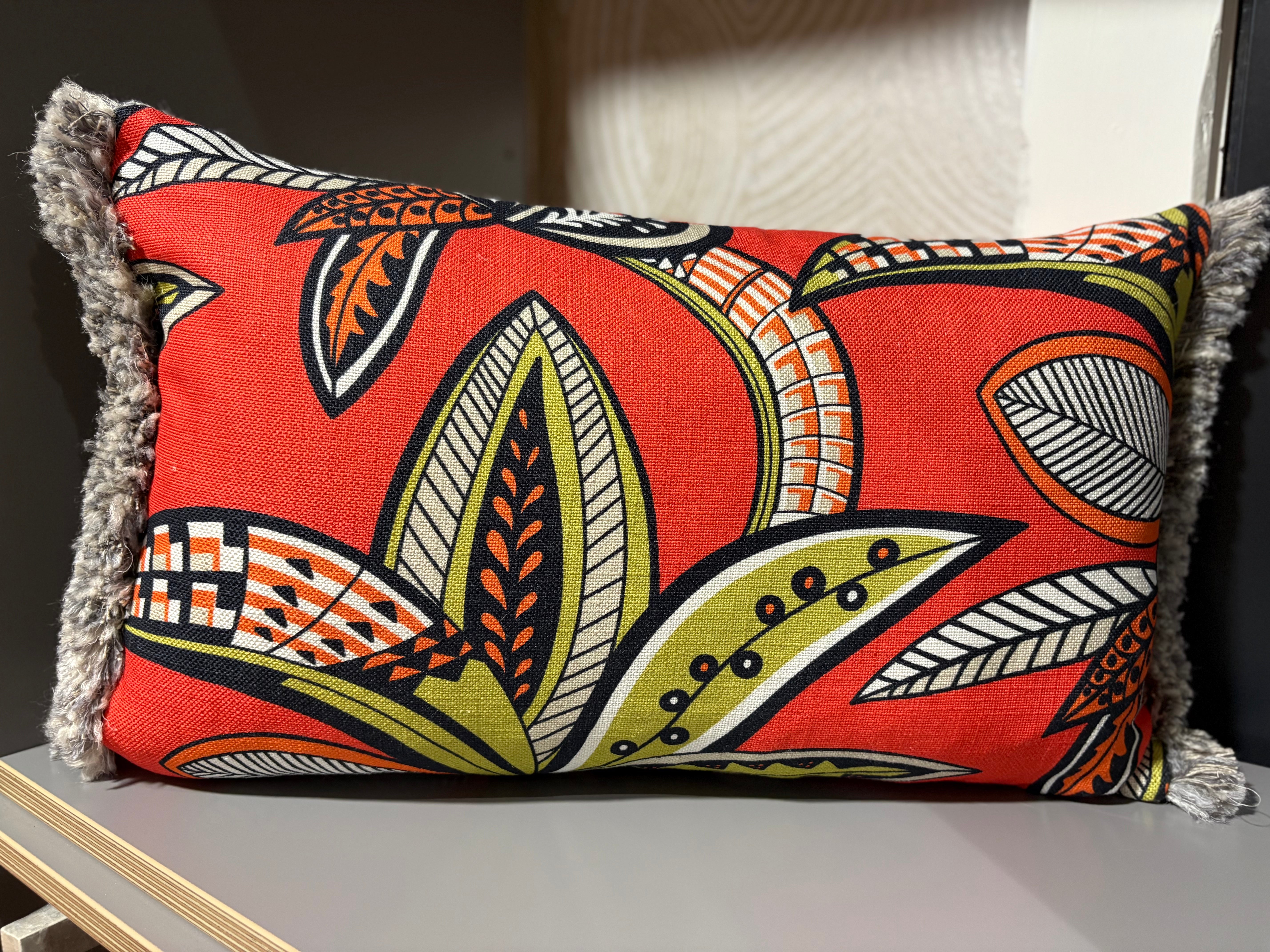 Boussac fabric with Gaston y Daniela fabric on the back, mixing a contemporary crewelwork with a printed linen in an exuberant palette of black, white, tangerine, and apple green. A grey and stone multi-textured ruche trim finishes it off beautifully.
