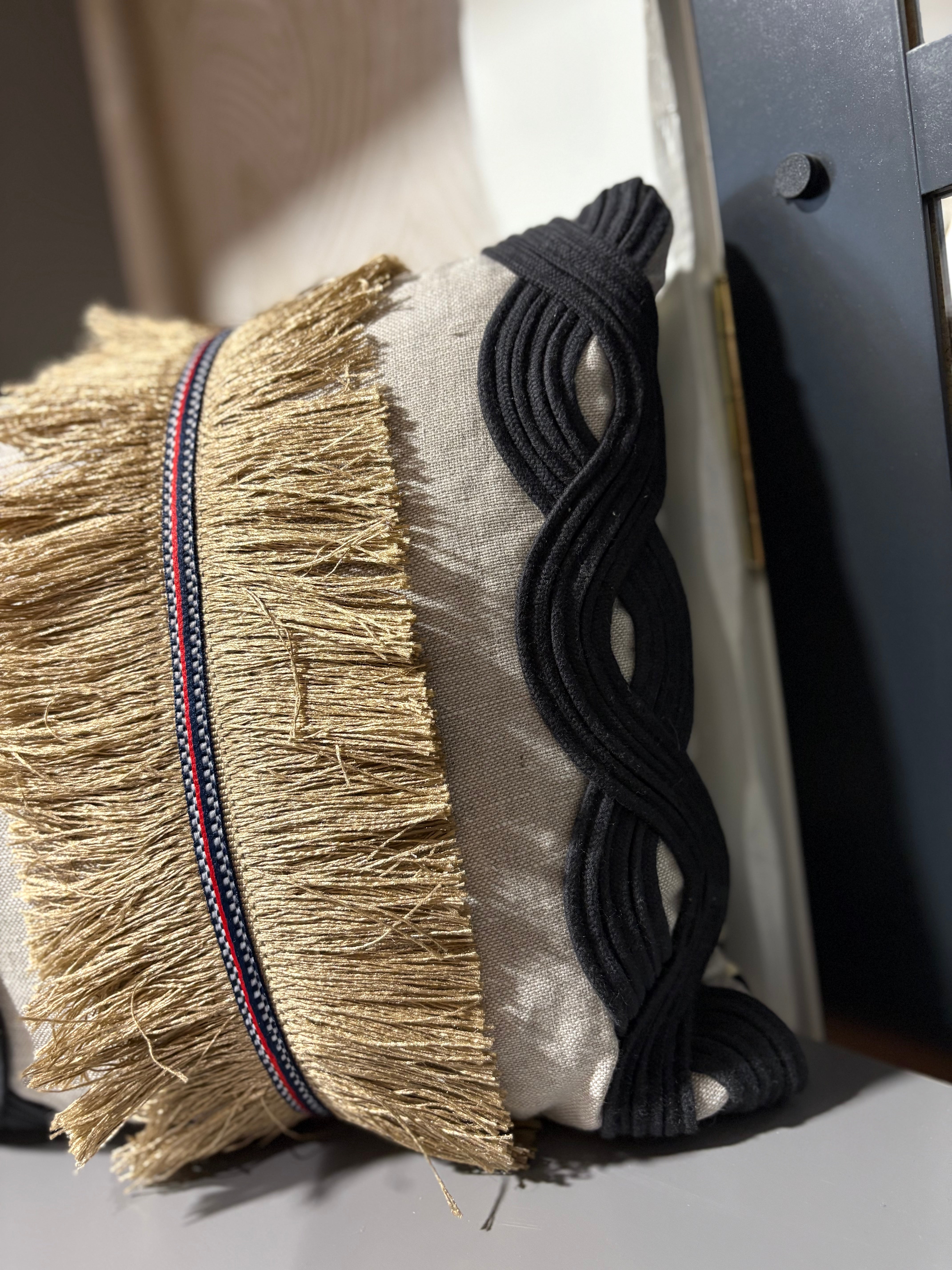 Incredible Pierre Frey fabric constructed with heavy brush fringe and coiled black braids with a black jungle print on the back.