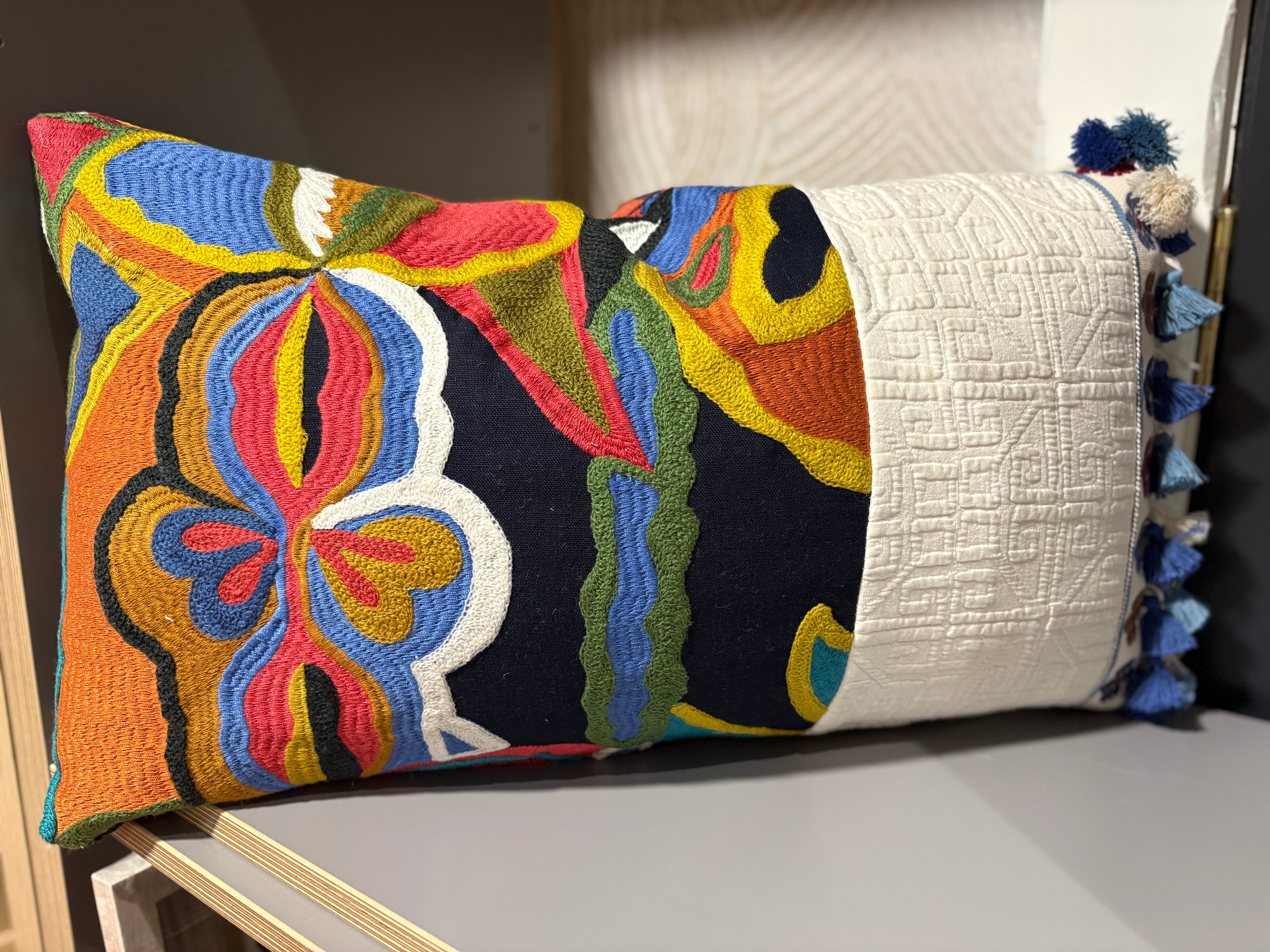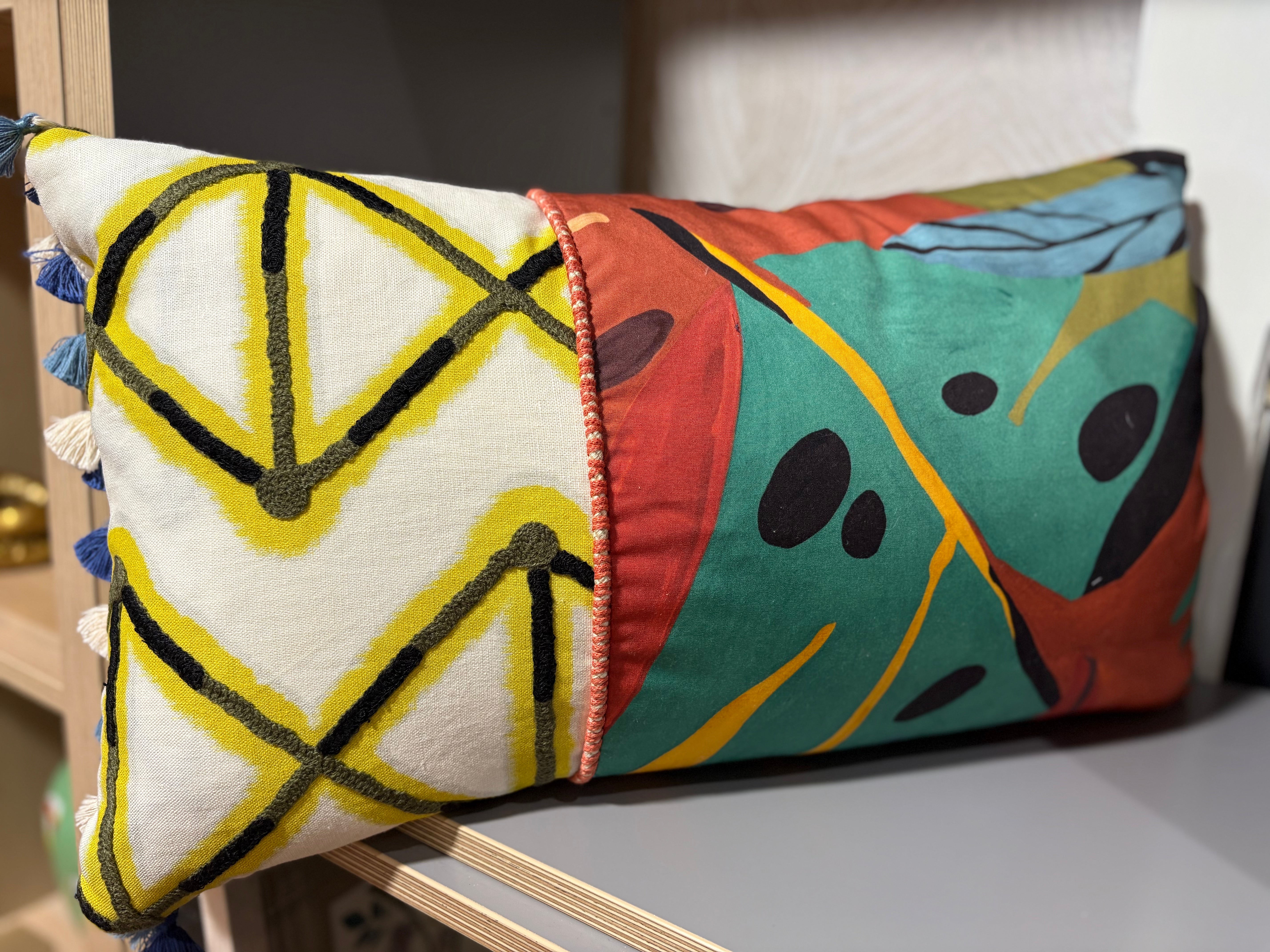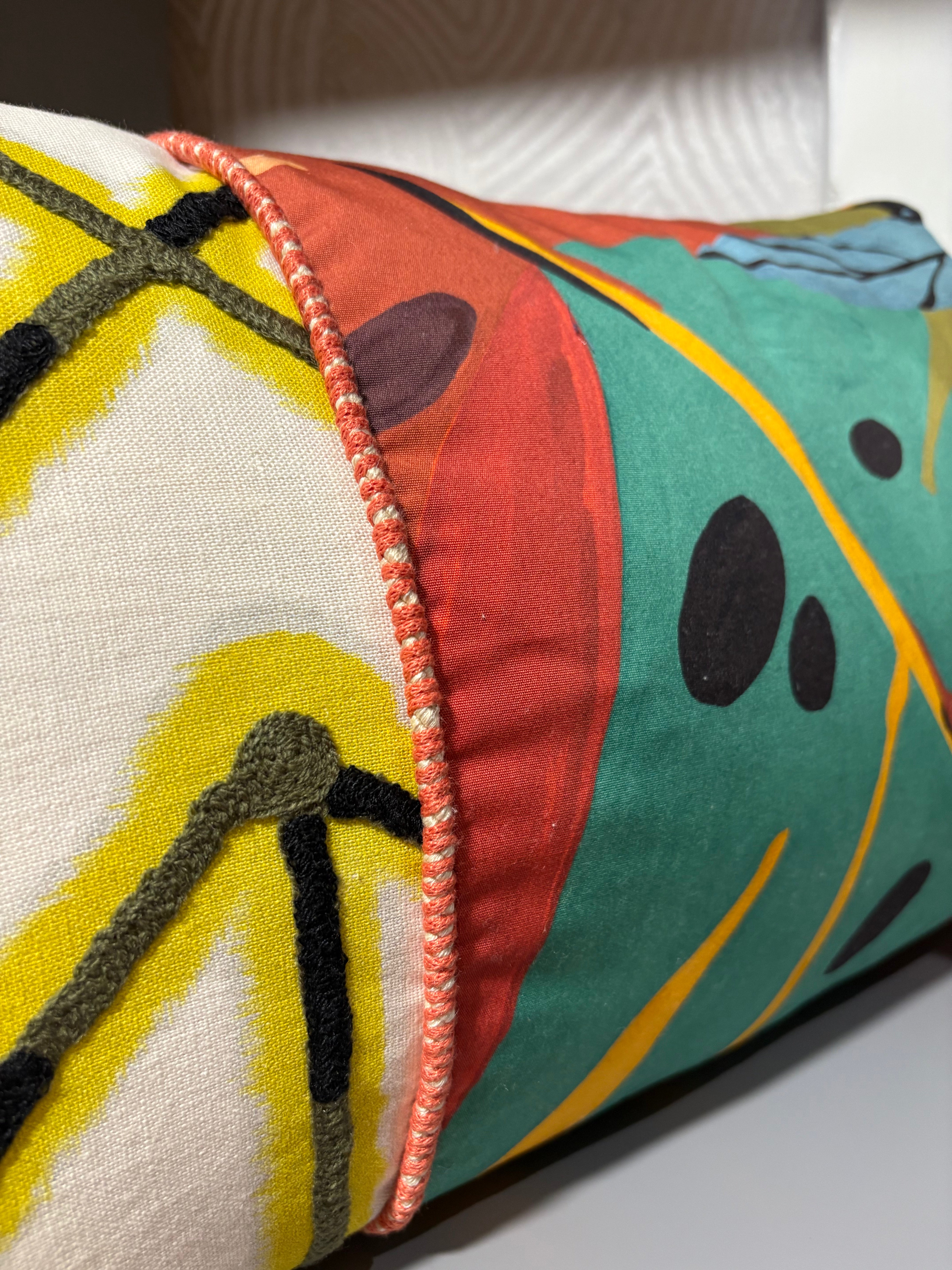 The back features a printed leaf design in coral, green, and black with a yellow and white crewel work border.