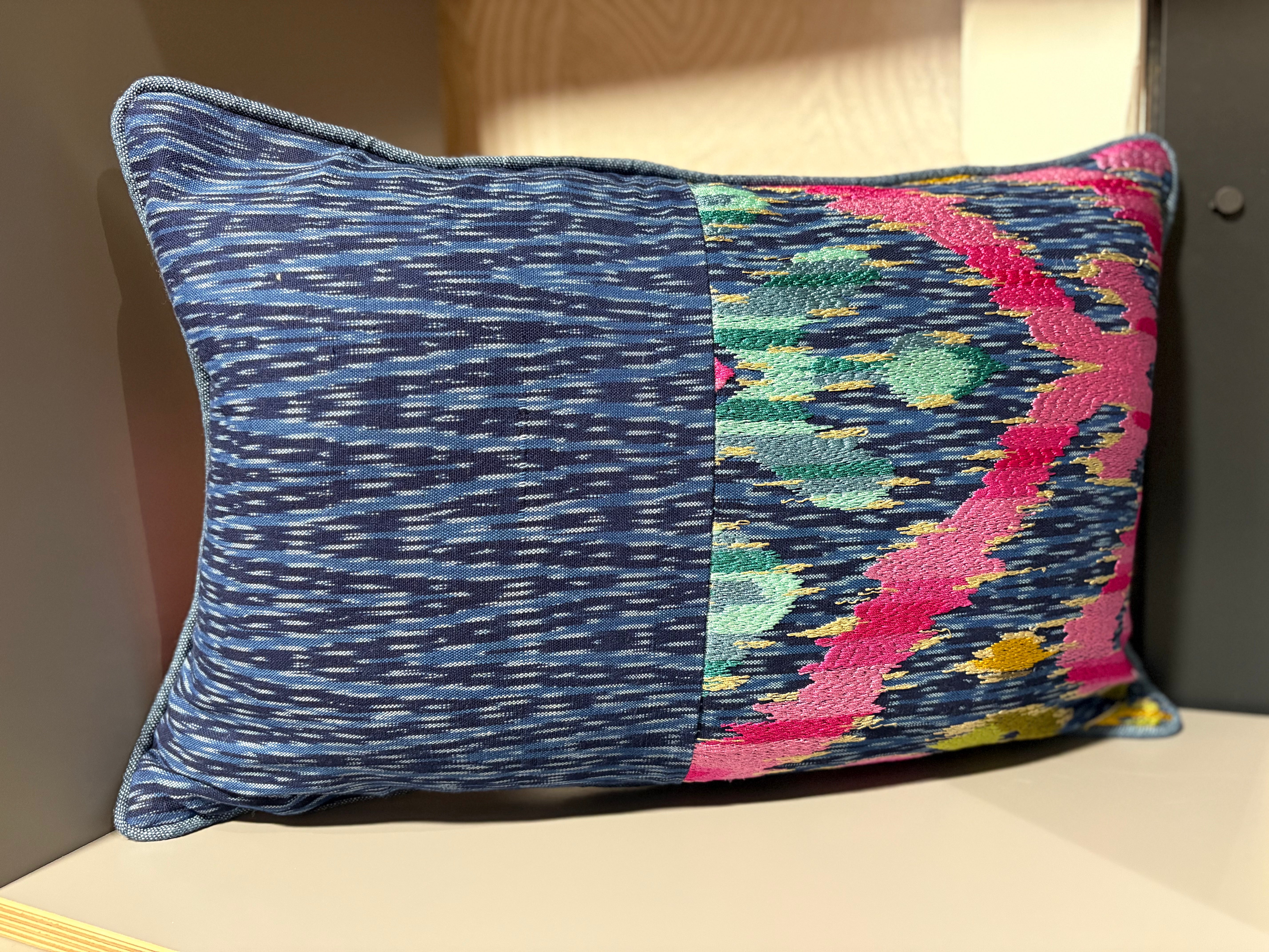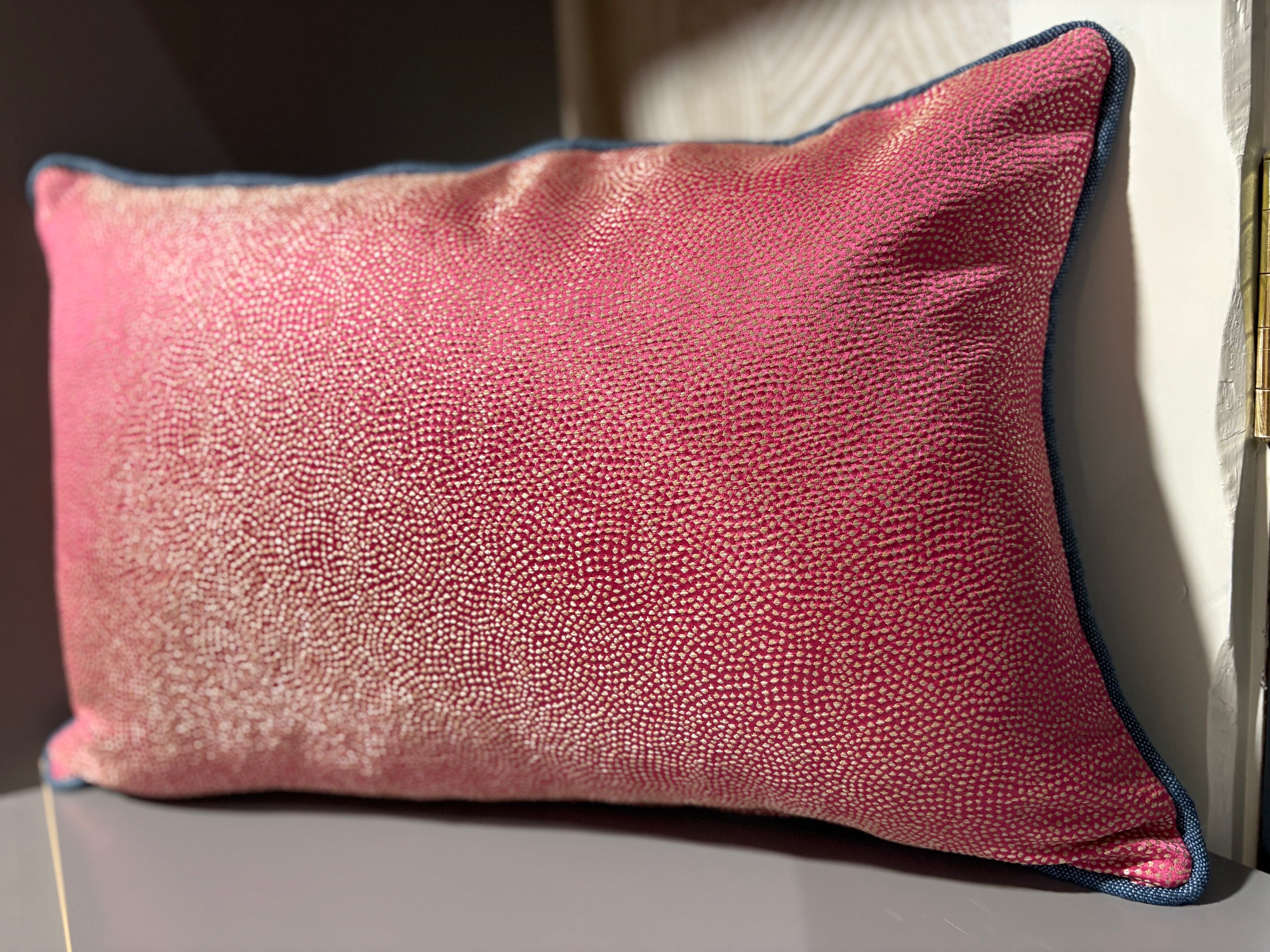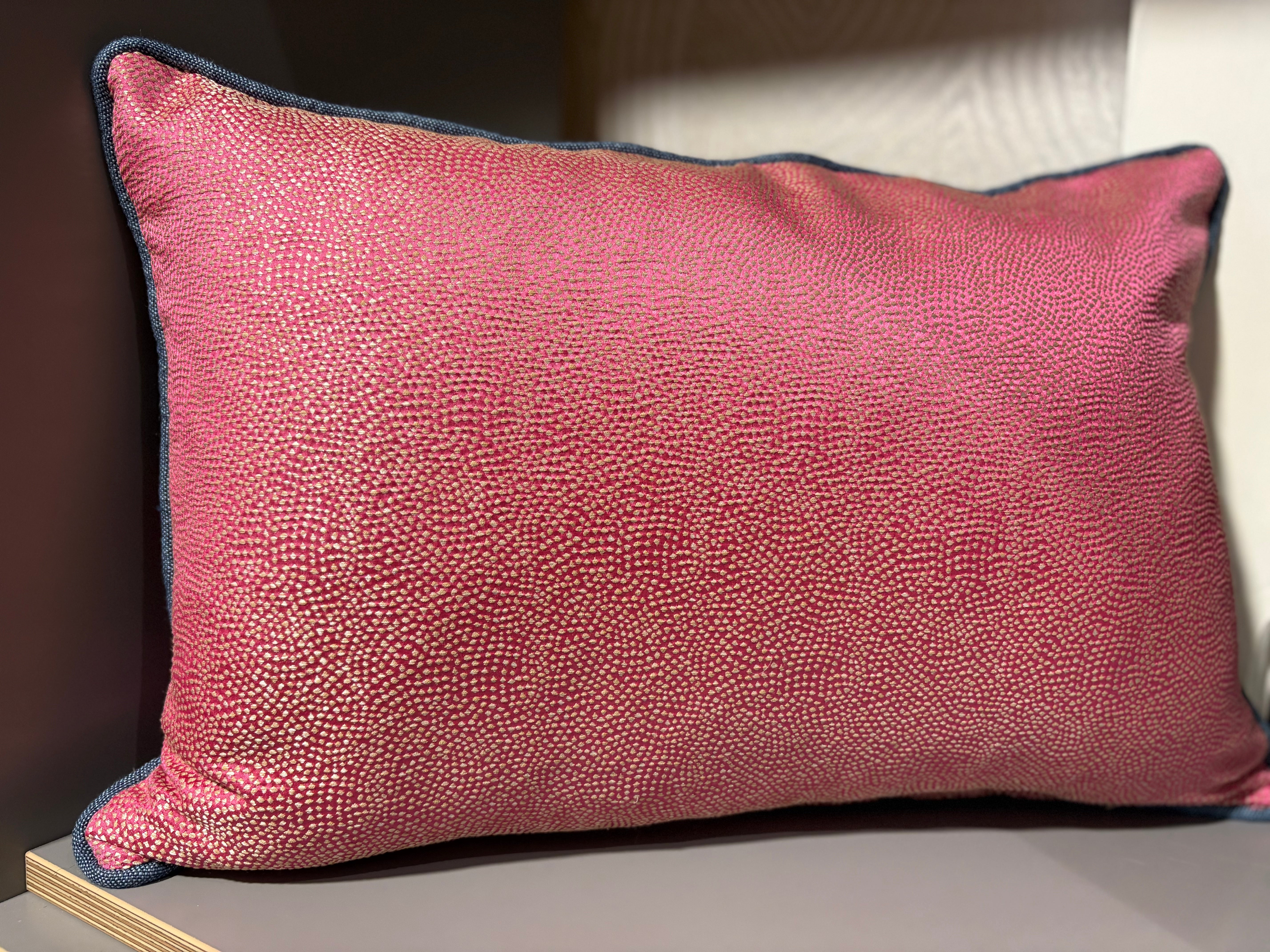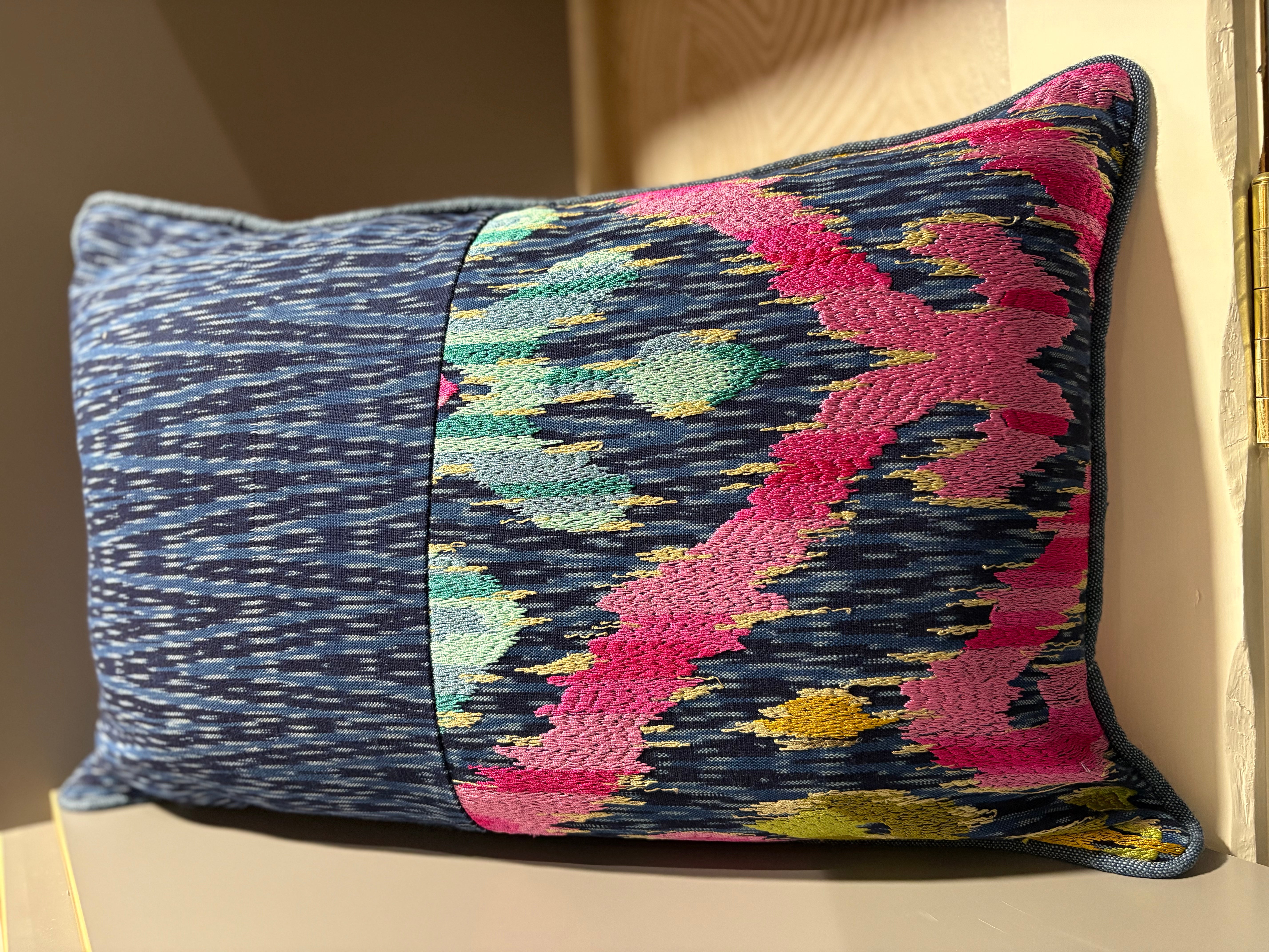 Another stunning Pierre Frey embroidered fabric in indigo tones with raspberry, turquoise, and gold accents. The indigo border is a horizontal chevron which also is woven onto the background of the embroidered fabric. Piped in indigo and backed with a Designers Guild satin weave in pink.