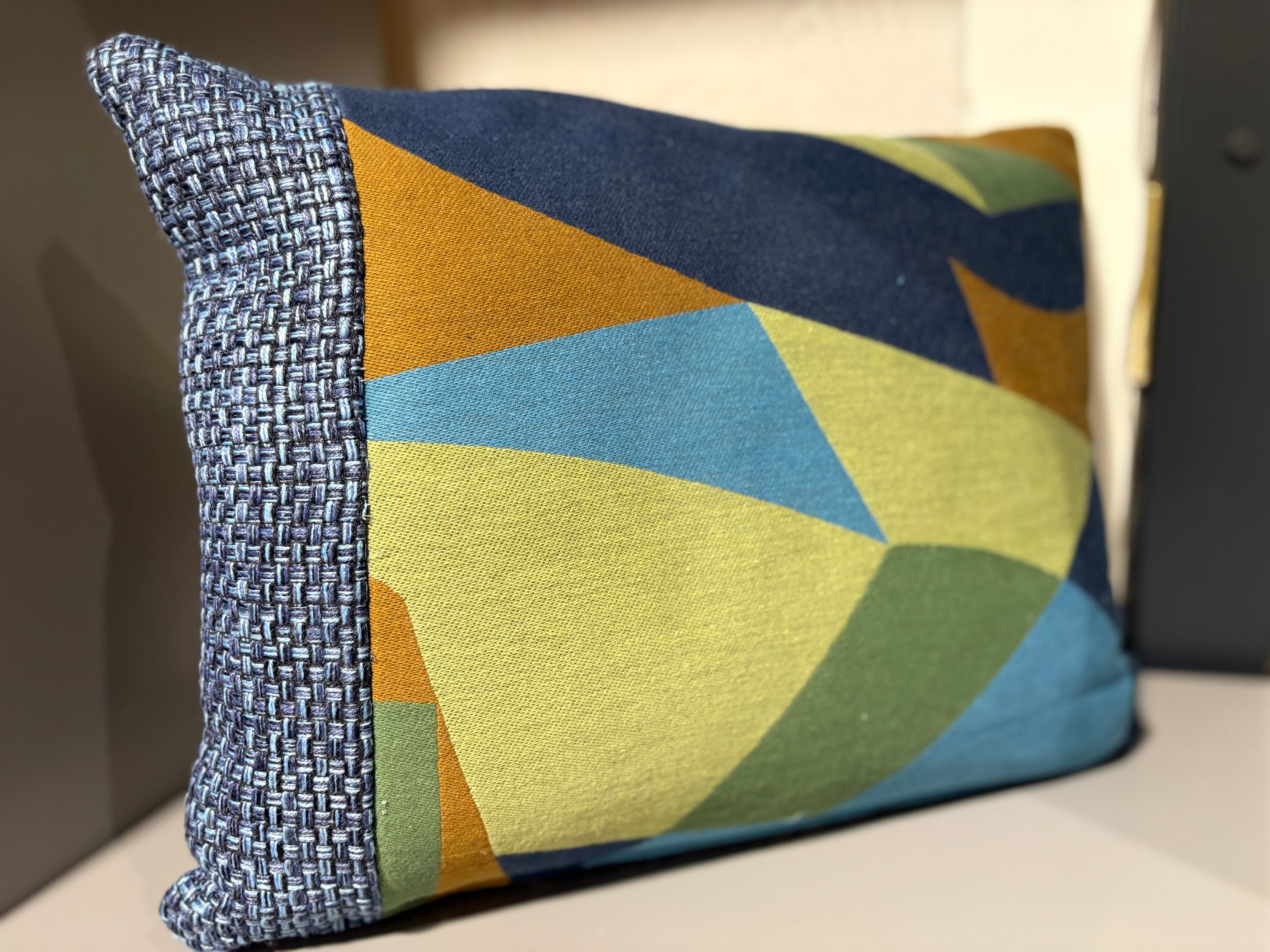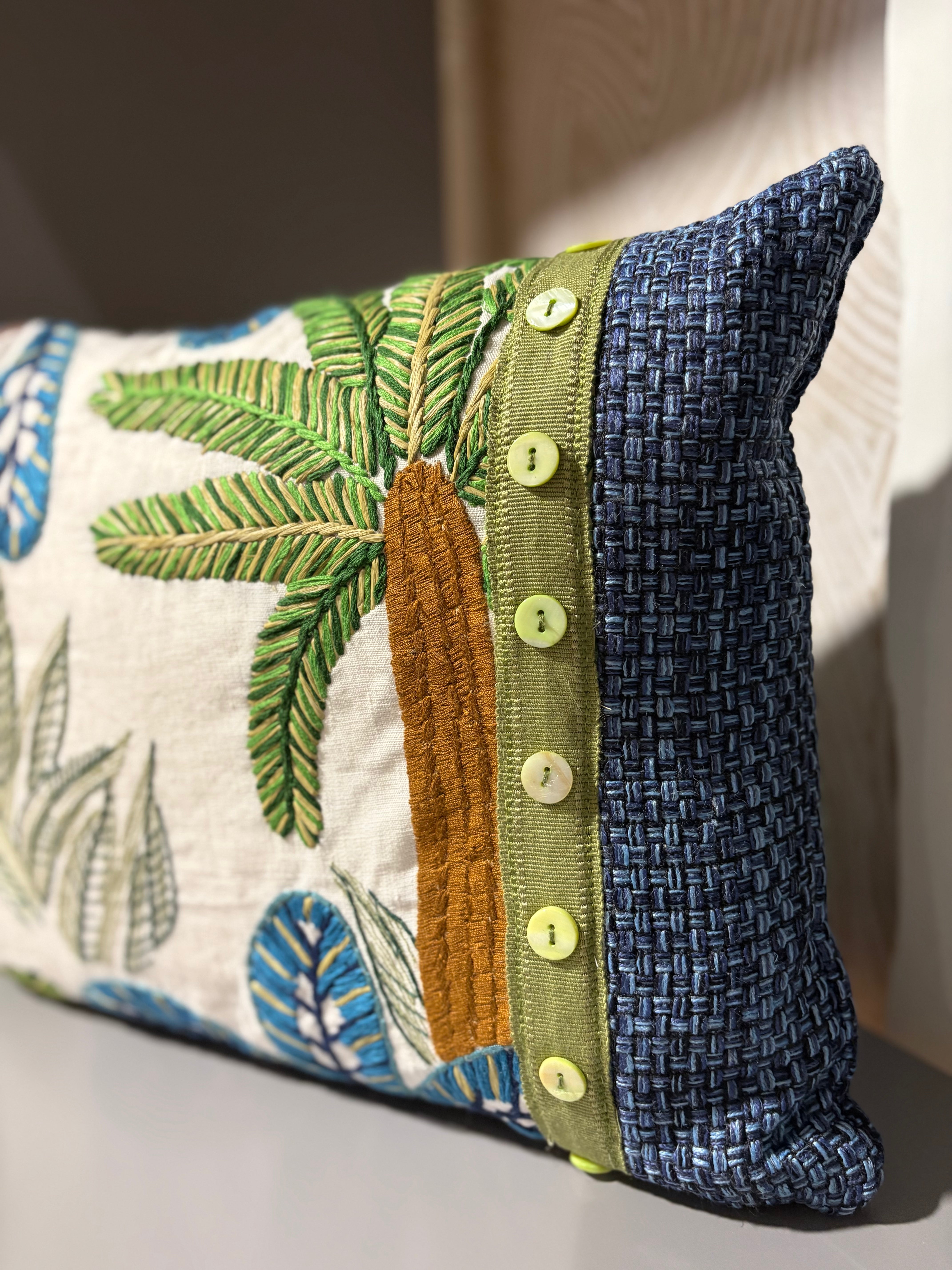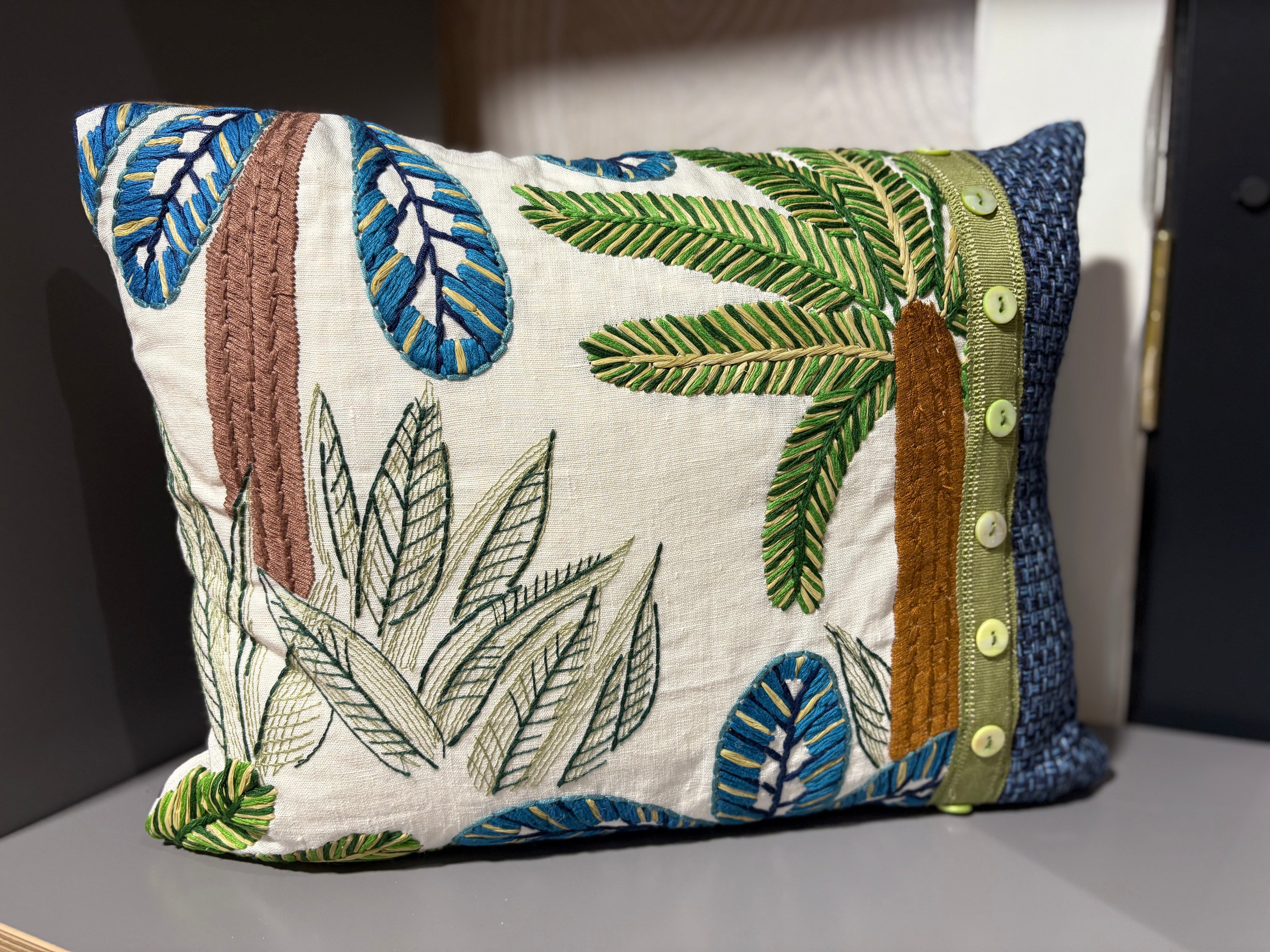 Multiple embroidery techniques make up this striking cushion in a palette of blue and green. On the back is a woven contemporary blue and green design and finished with a smart button trim.