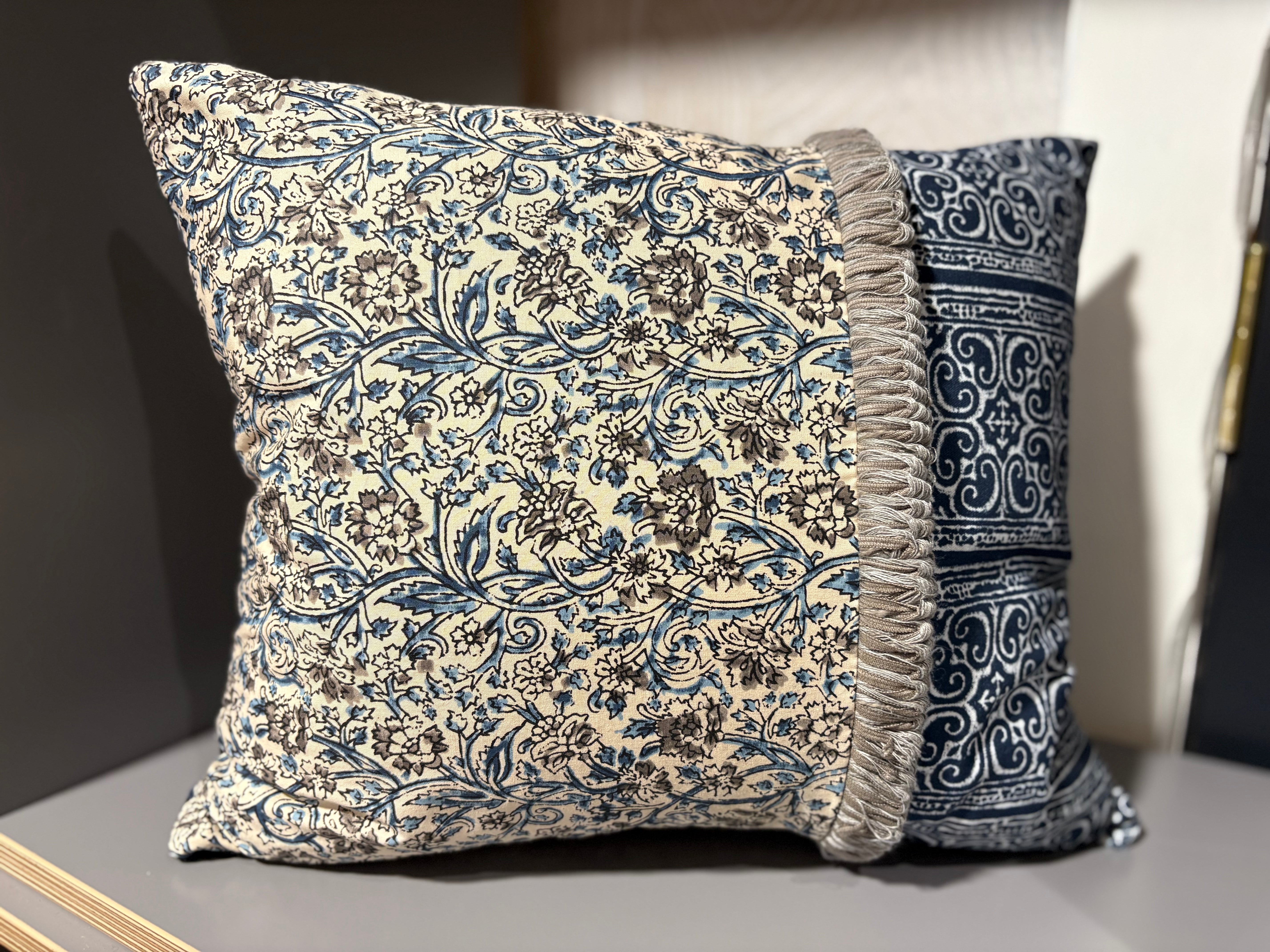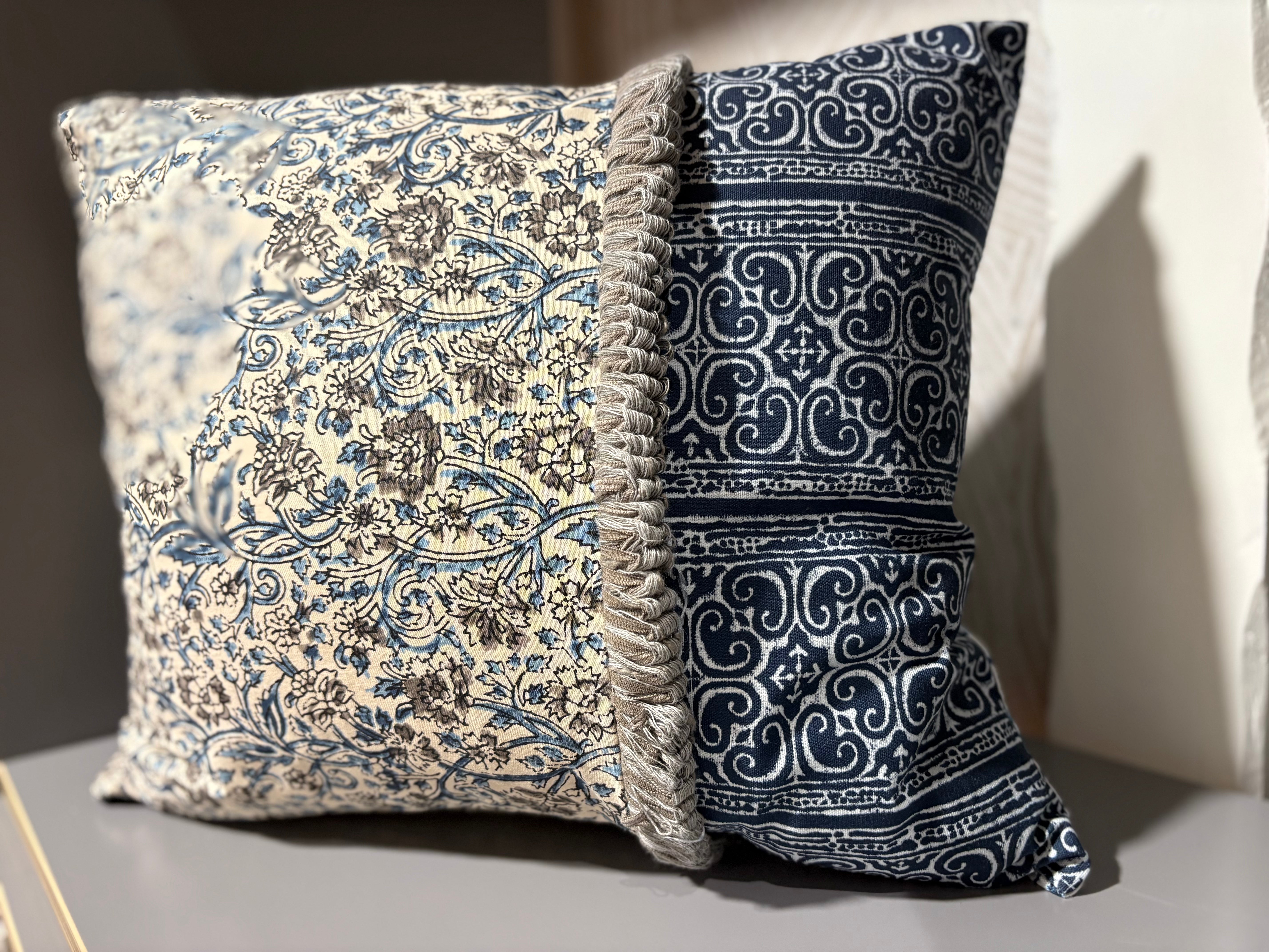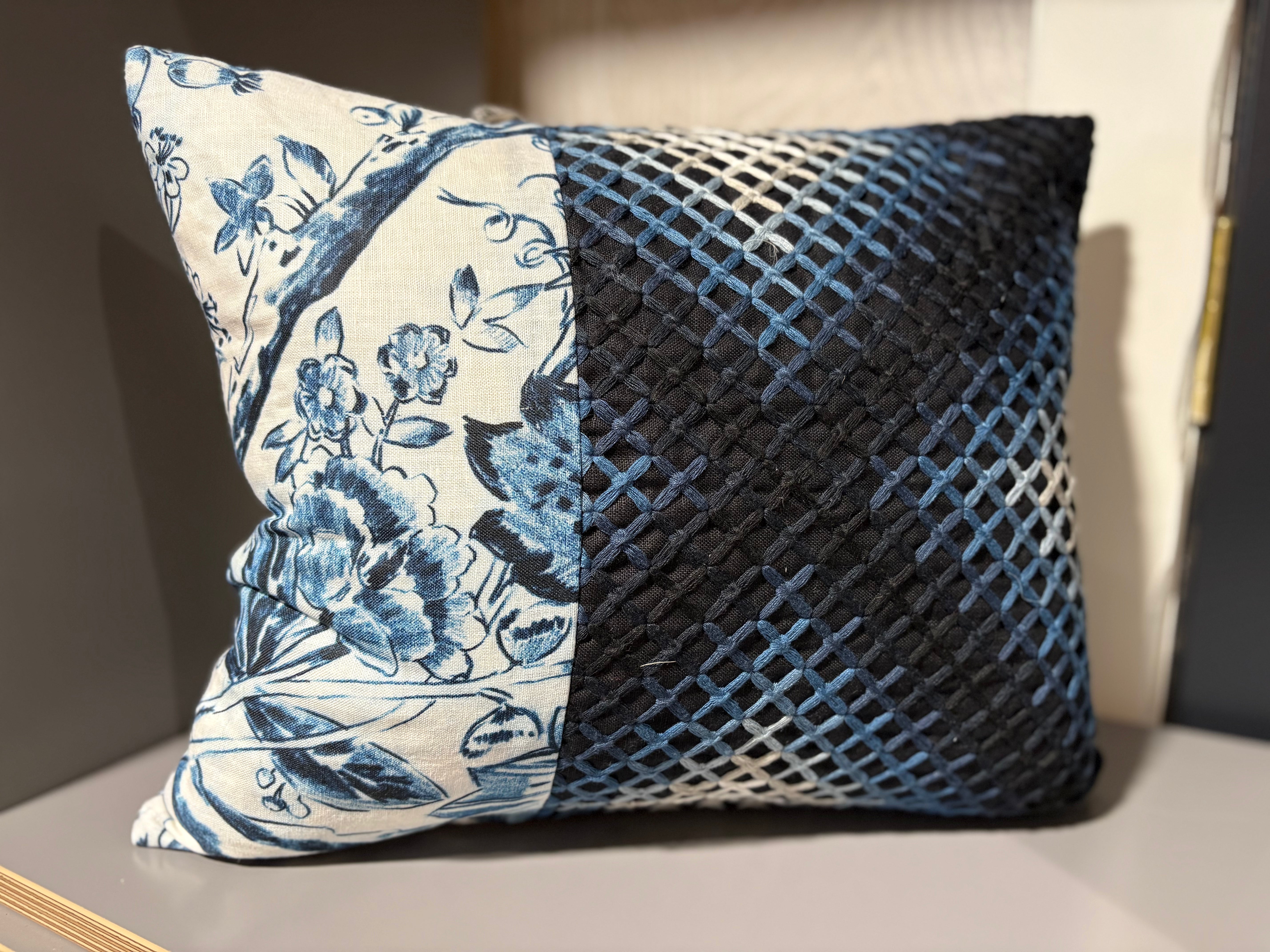 Mix of Pierre Frey fabrics in various tones of indigo and white and featuring a smart grey ruche trim. The trellis design is a very unusual cross-stitch, adding beautiful texture and character to this cushion.