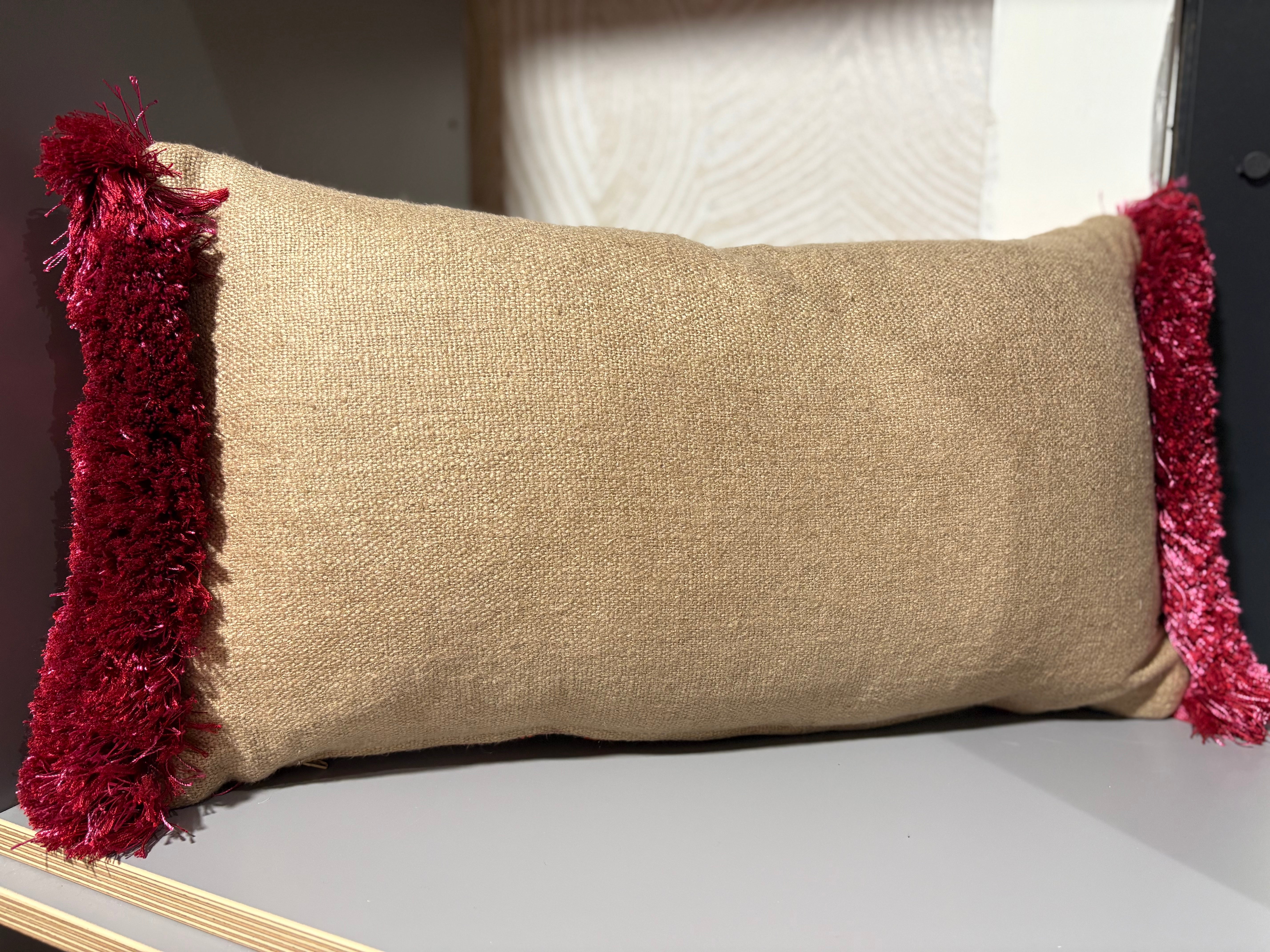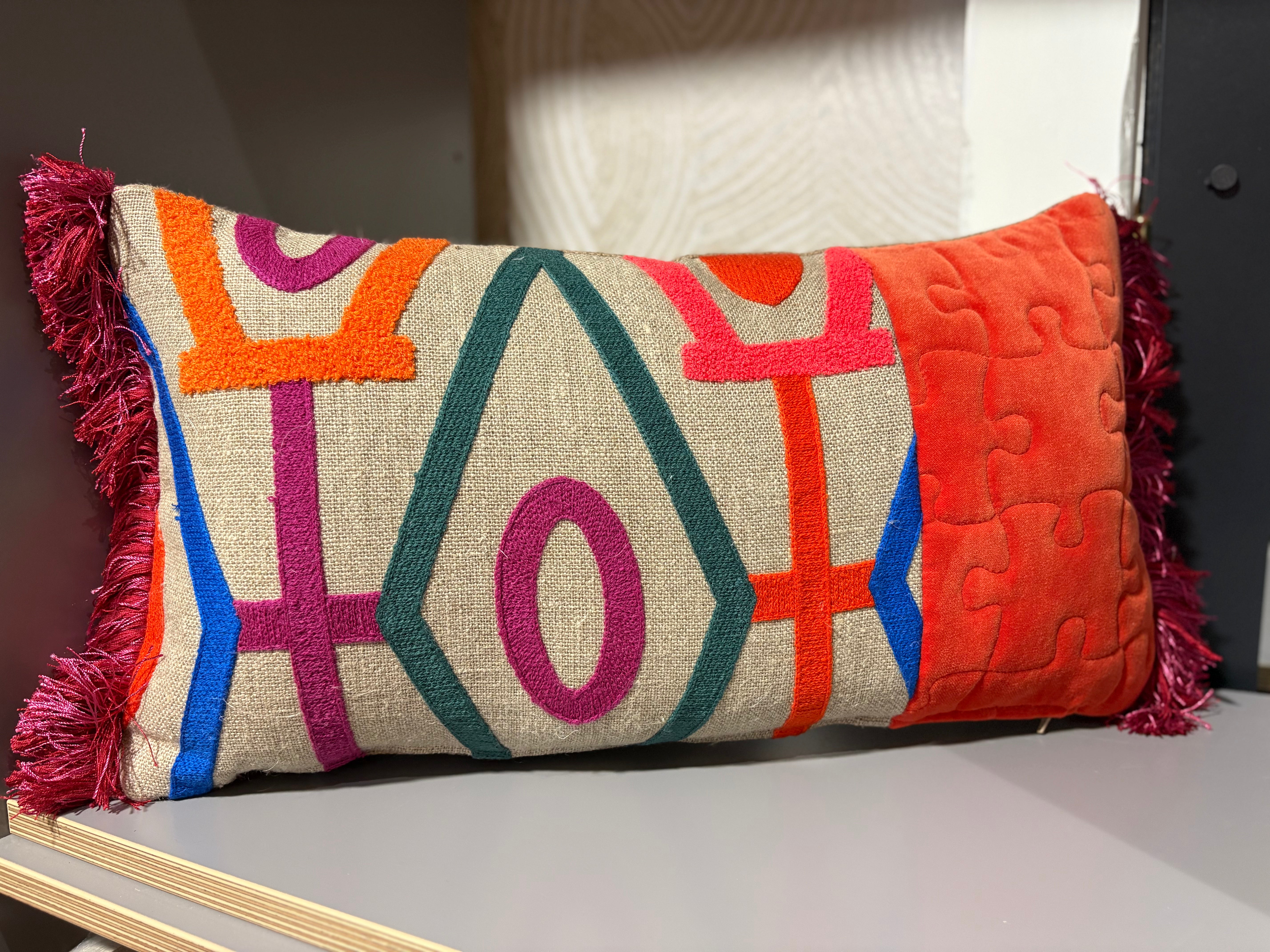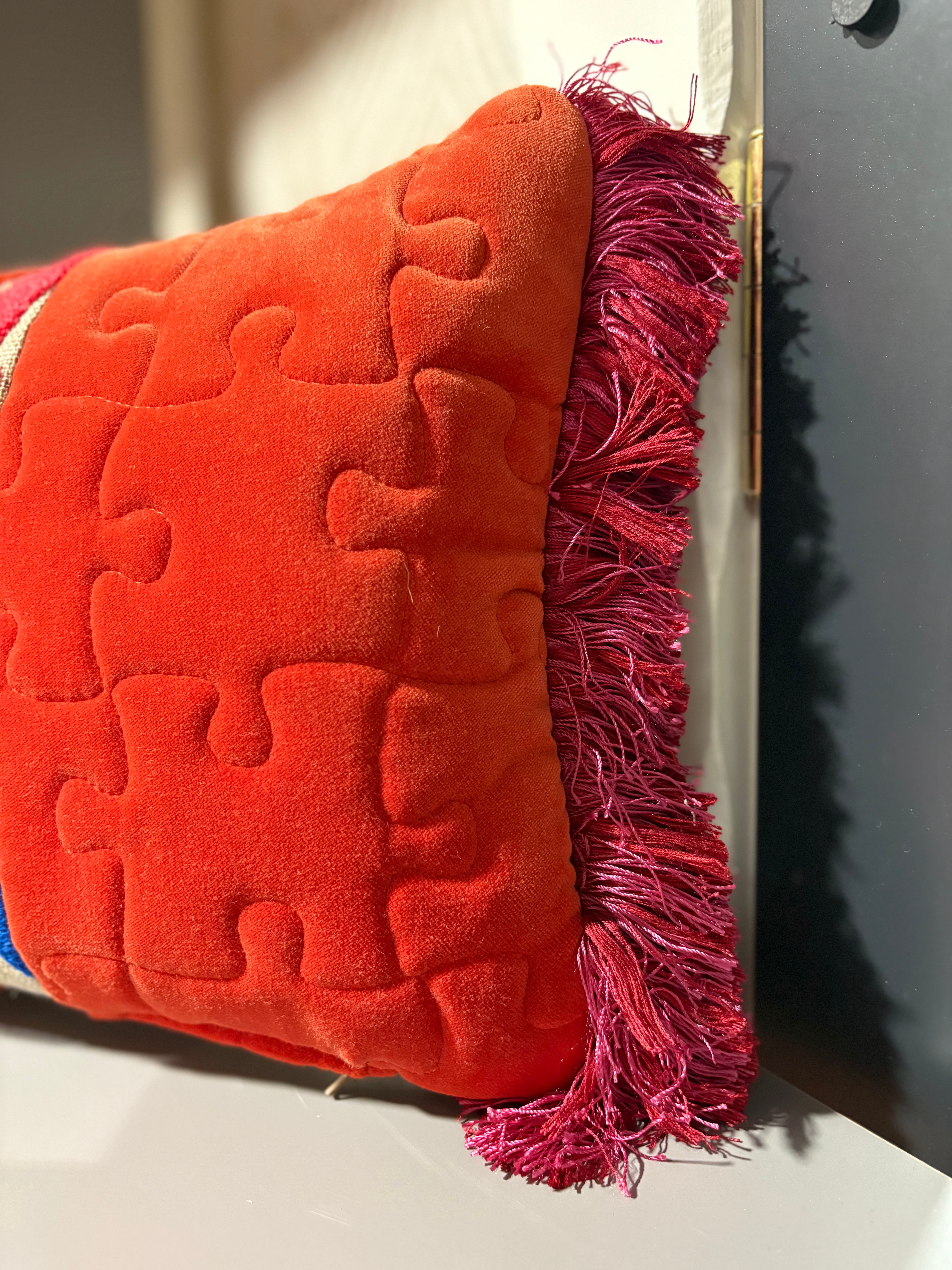 Mix of Boussac fabrics featuring a multicoloured contemporary crewelwork with a tangerine jigsaw border and a very generous, slightly wild raspberry ruche trim from Manuel Canovas.