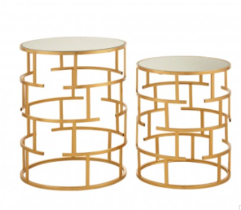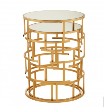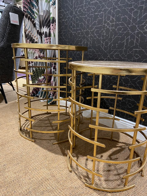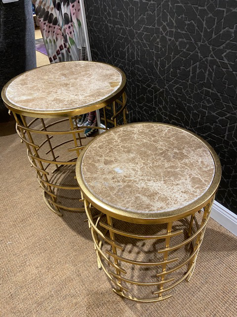 This is marble topped set of two side tables with a gilded metal finish. Reminiscent of the art deco period, they neatly stack to provide practical and compact table useful for lamps, or just for your supper.