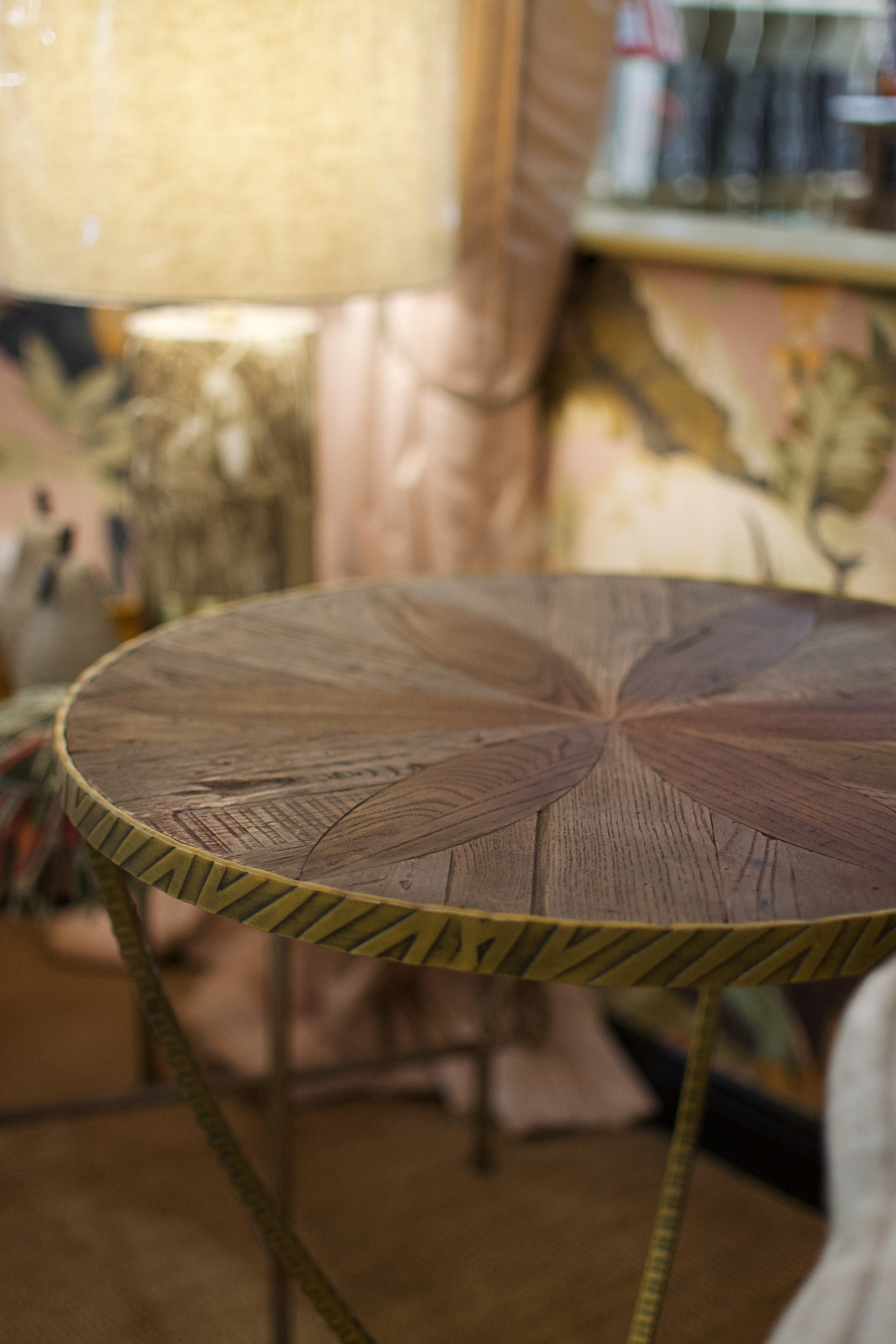 A boho-style accent table that combines patterned wood with textured iron.