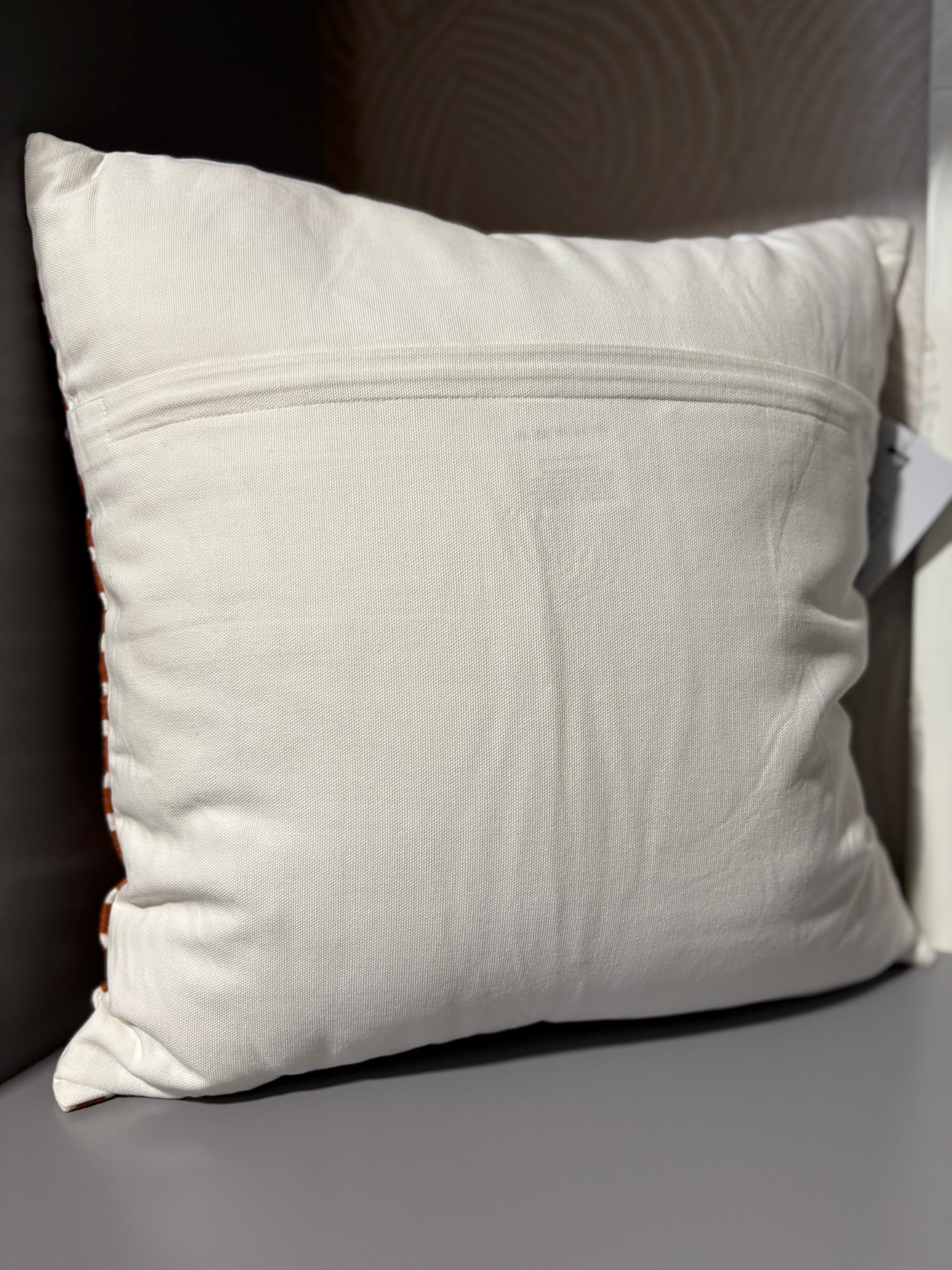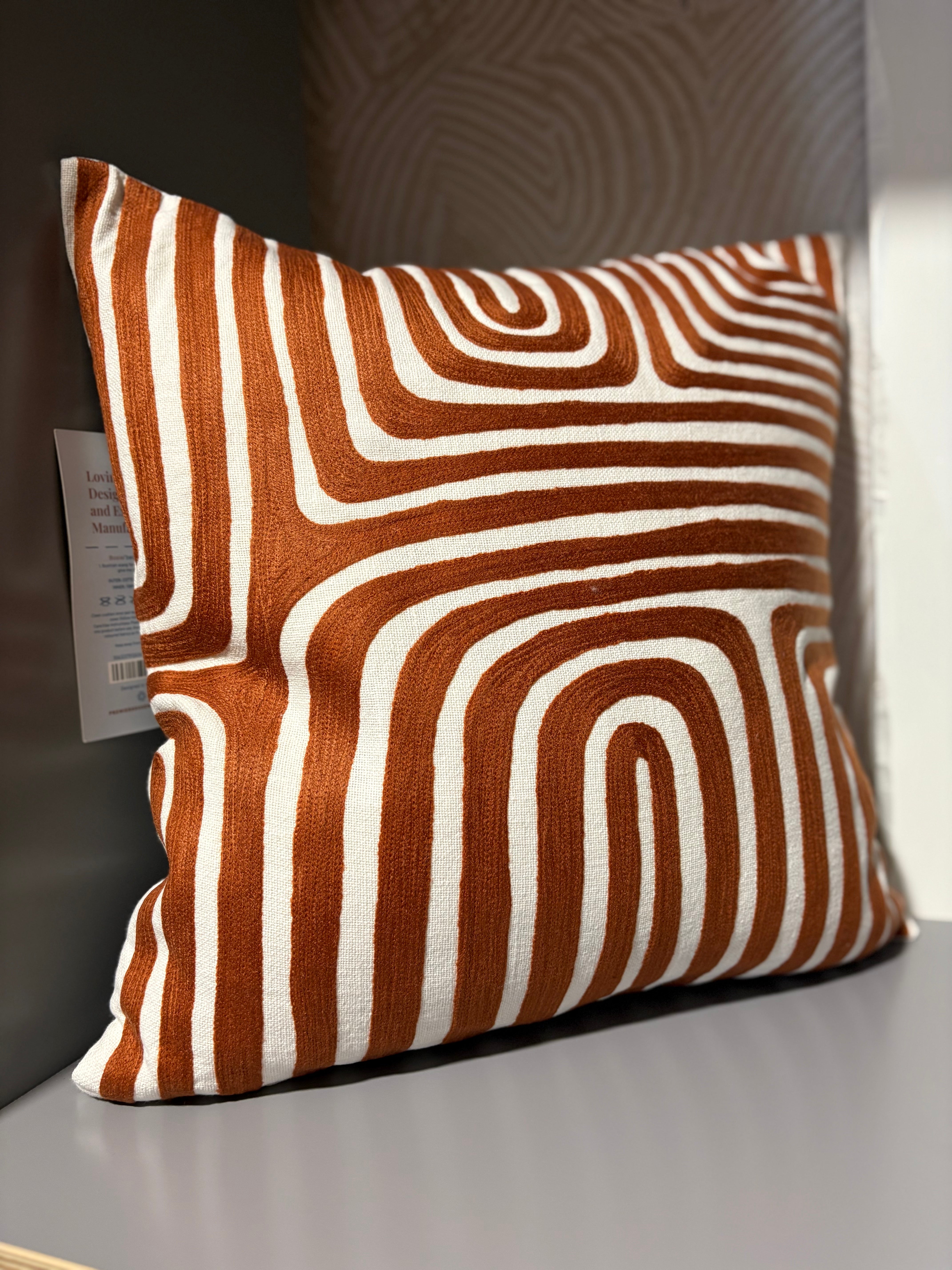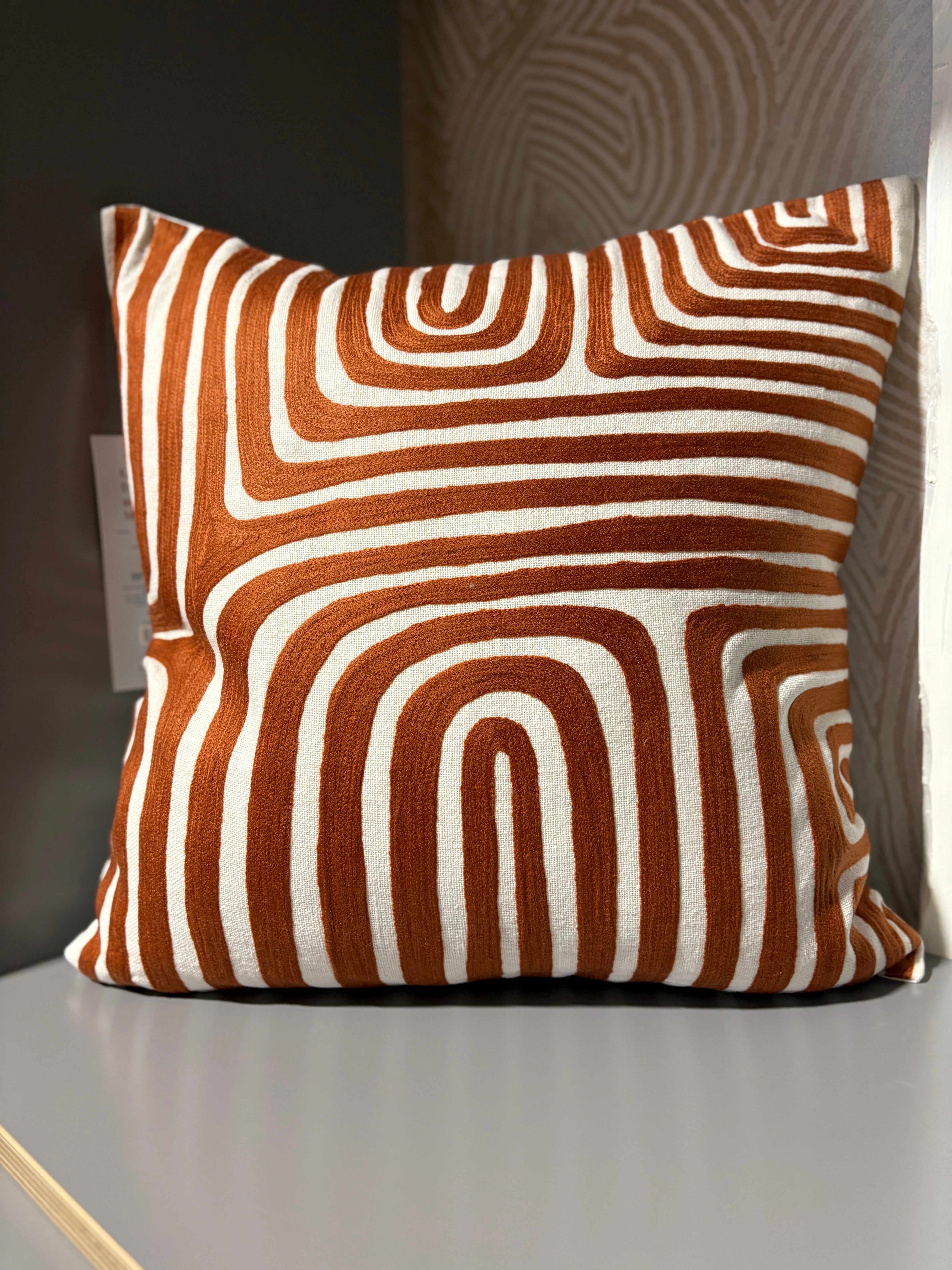 Made from premium quality fabric, this modern cushion features intricate embroidery and a textured surface, enhancing its depth and tactile appeal. Accentuated against the natural background, the abstract rust design adds a stylish touch to an array of settings. The cushion inner is a generous fibre-filled pad.